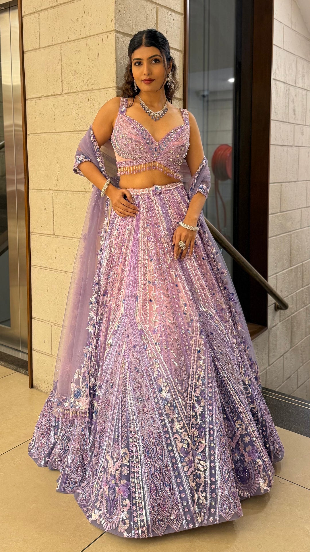 Lavender Luxury Hand-Embroidered Designer Lehenga Set with Sequins, Zari