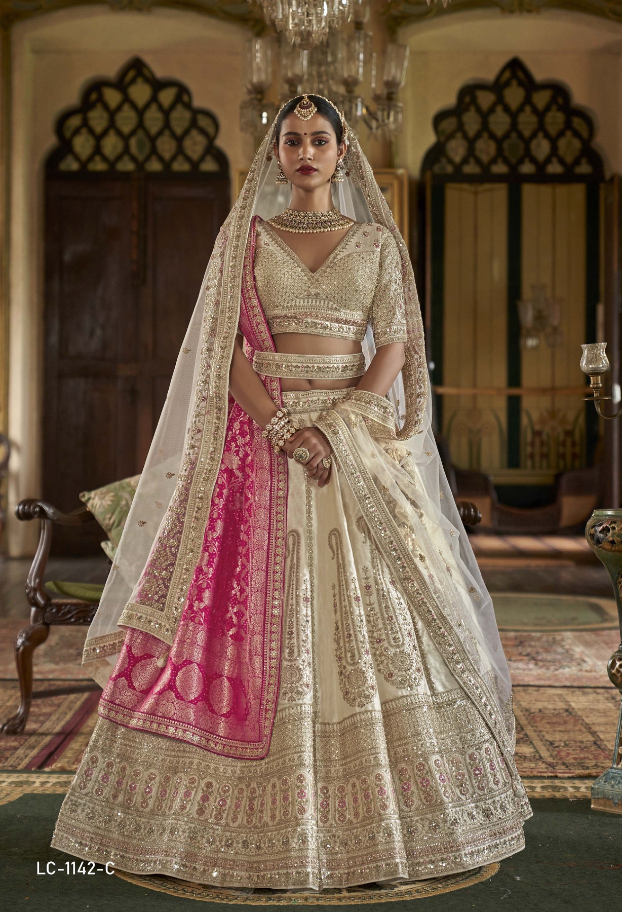 Ivory Bridal Lehenga with Contrast Pink & White Double Dupatta