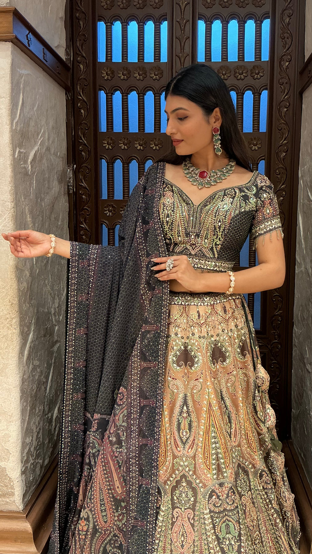 The beautifully embroidered dupatta complements the lehenga with detailed borders and fine embellishments, adding depth and regal charm. Every element of this outfit reflects premium craftsmanship and heritage artistry.
