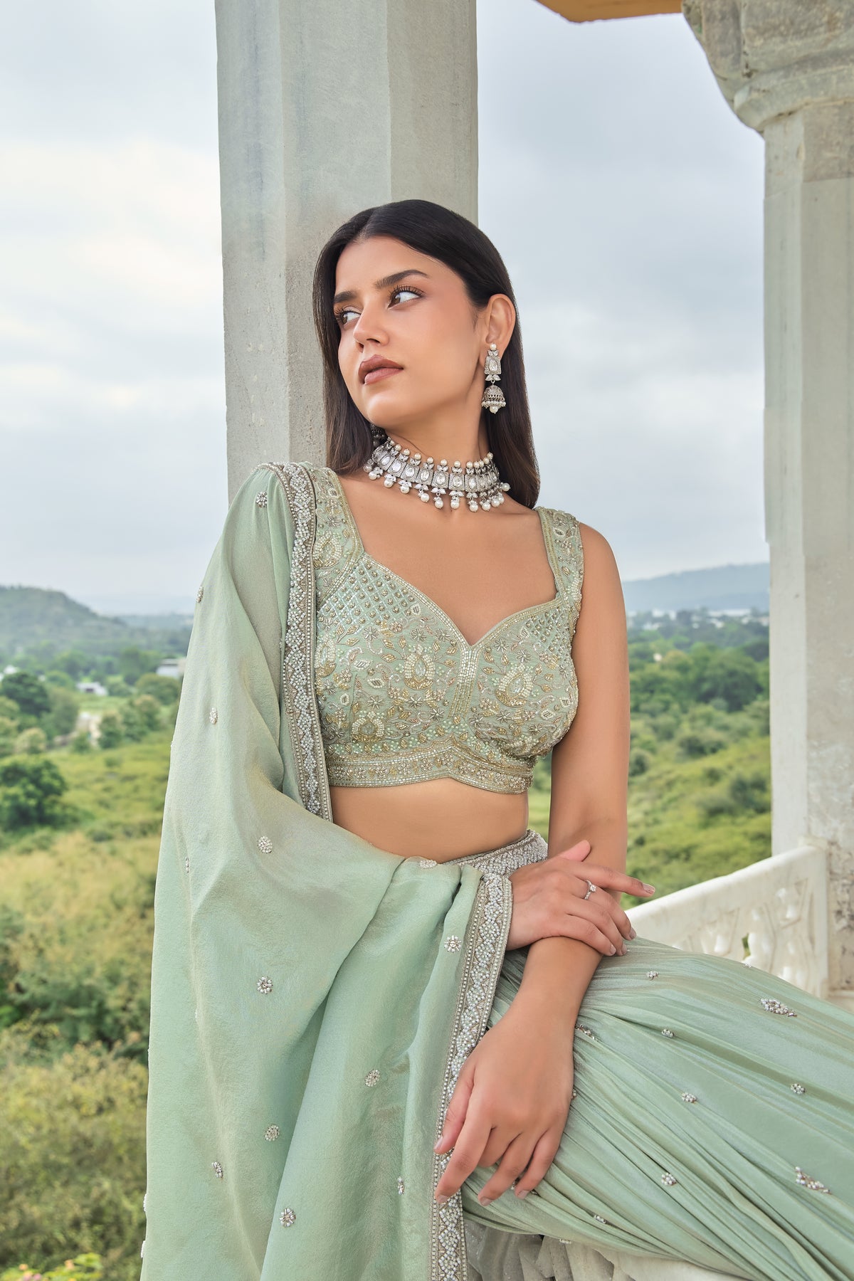 Step into timeless elegance with this Mint Green Luxury Hand-Embroidered Bridal Lehenga Set.