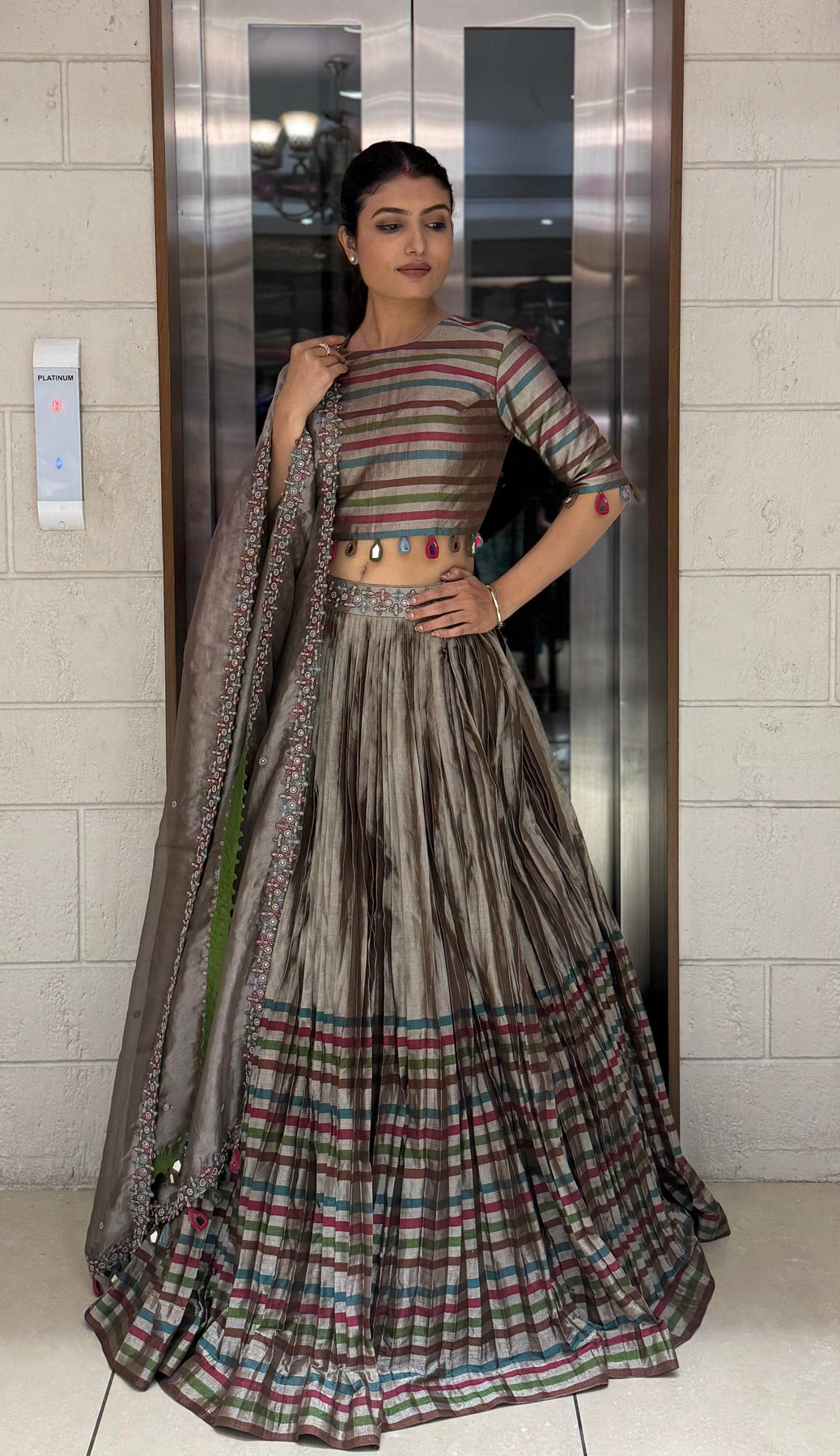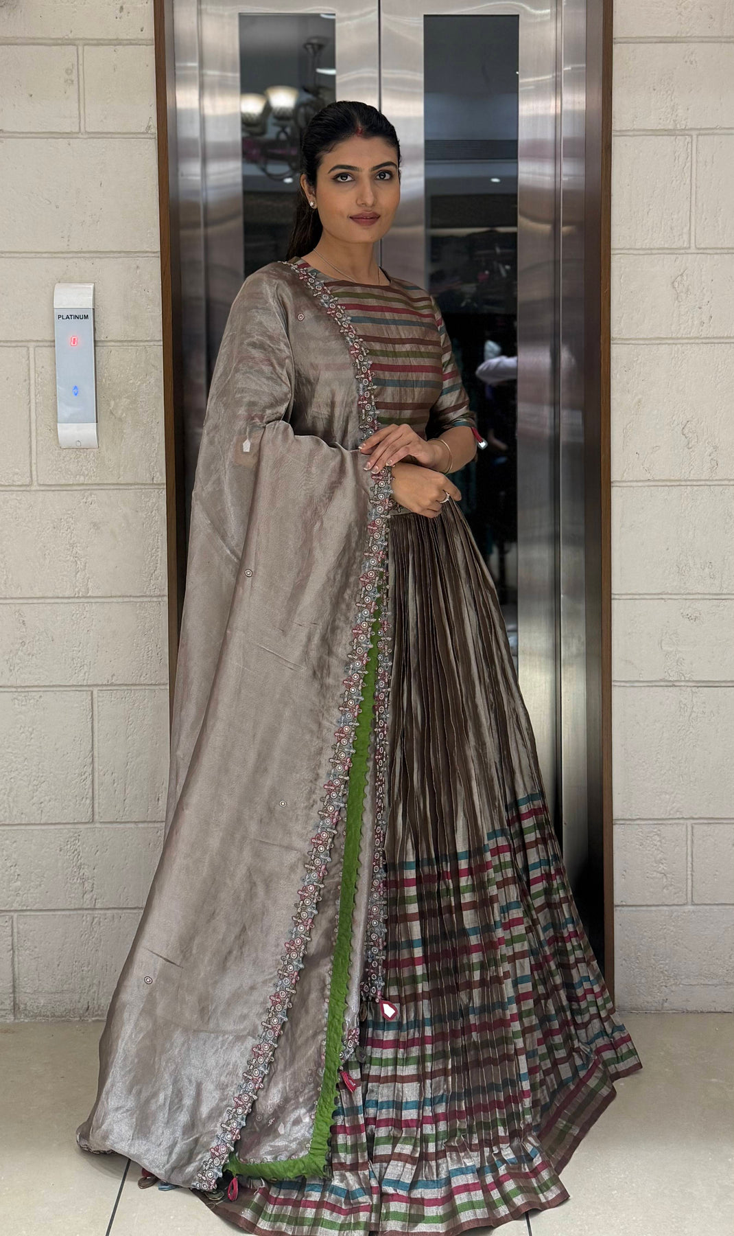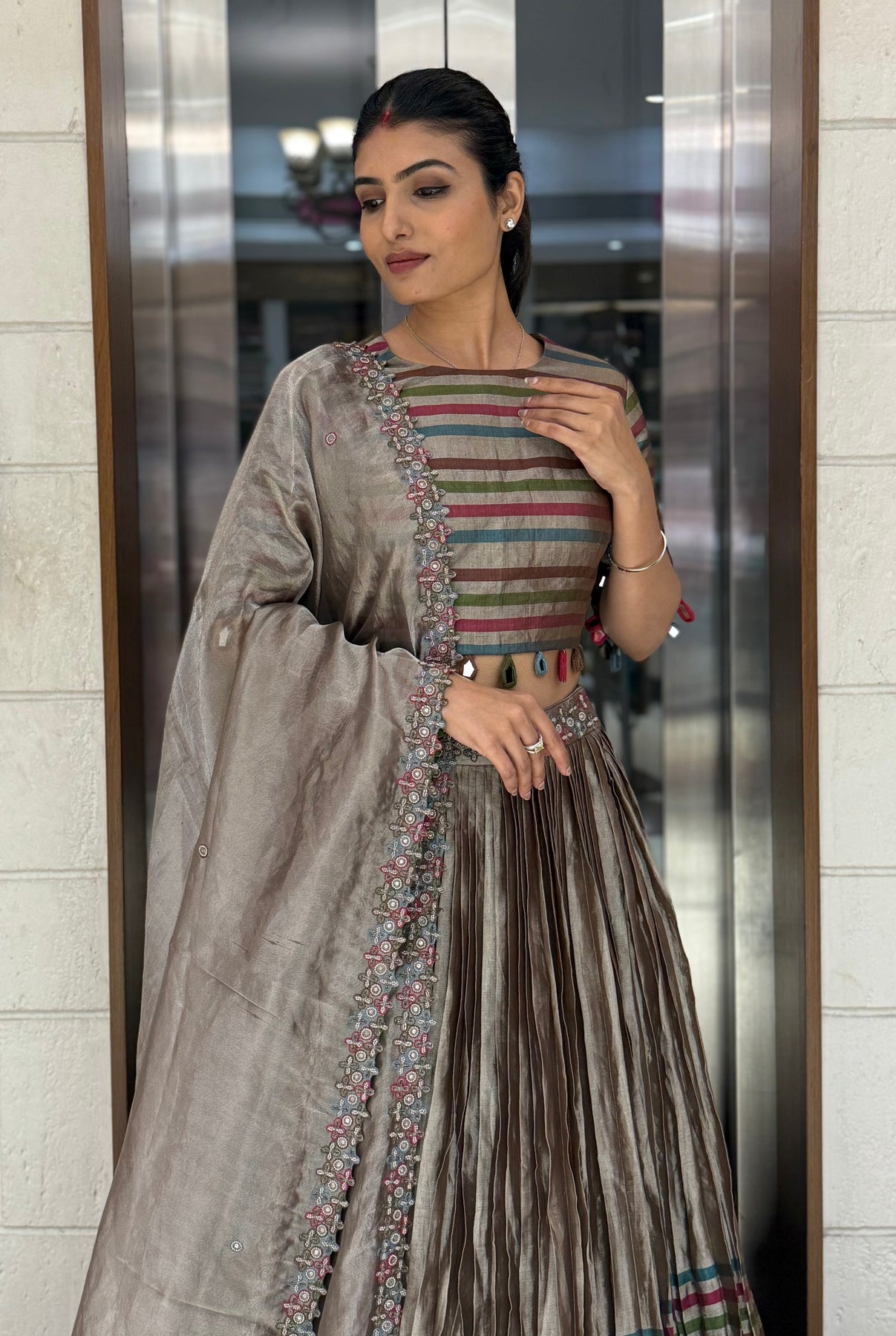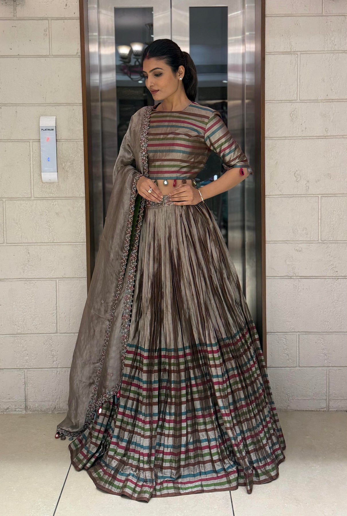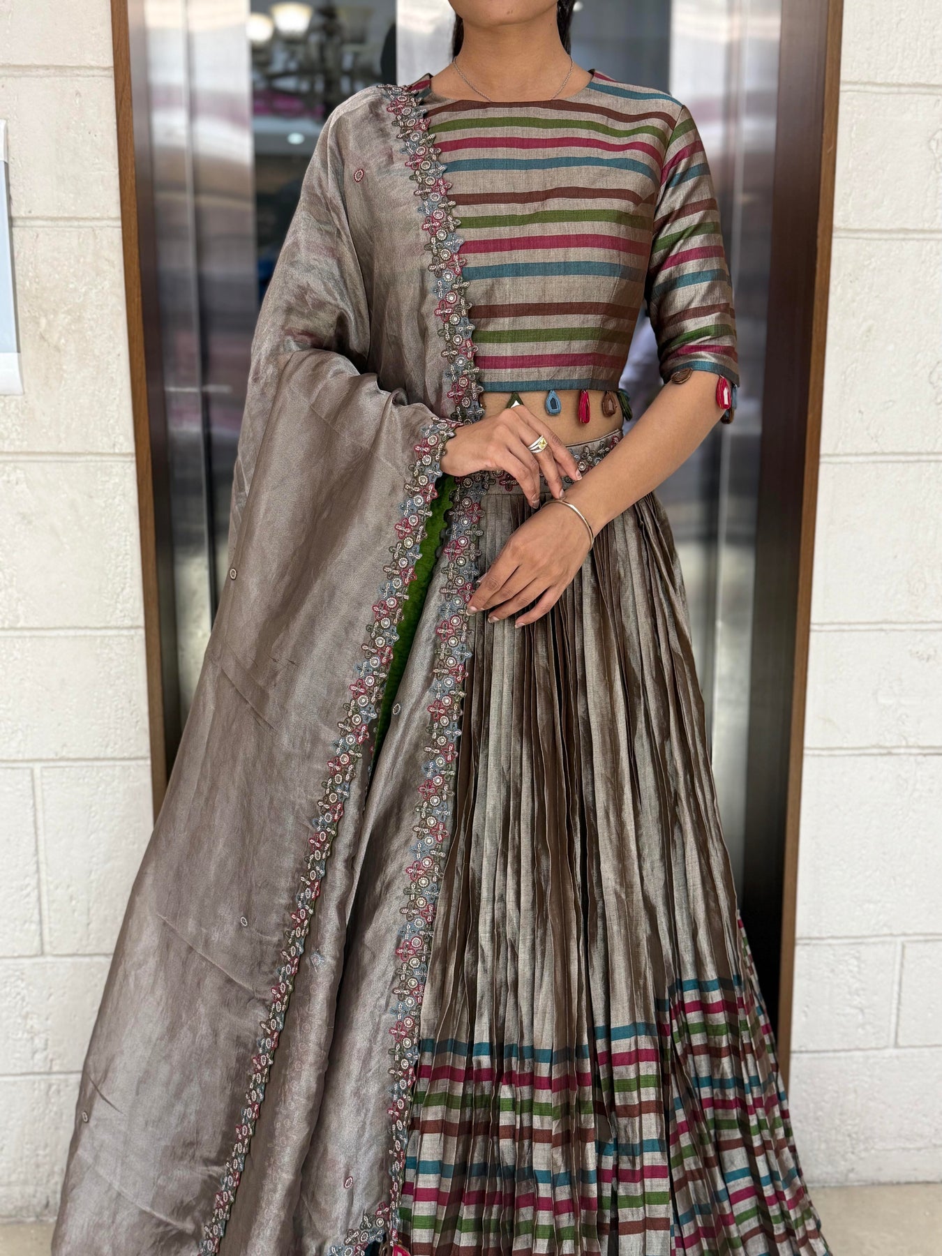 Crafted from luxurious tissue silk fabric, the lehenga features multicolor woven stripes that create a striking play of texture and sheen. The pleated silhouette adds movement and grace, while the subtle earthy tones of mocha brown, olive, and teal lend an understated sophistication.