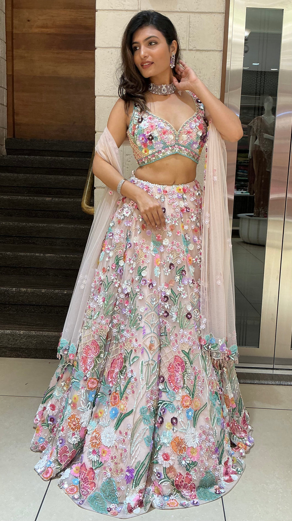 The lehenga skirt flows effortlessly with a light and airy feel, showcasing vibrant floral patterns in shades of pink and beige that create a perfect balance of sophistication and playfulness. The soft fabric ensures comfort while maintaining a flattering and flowy silhouette.