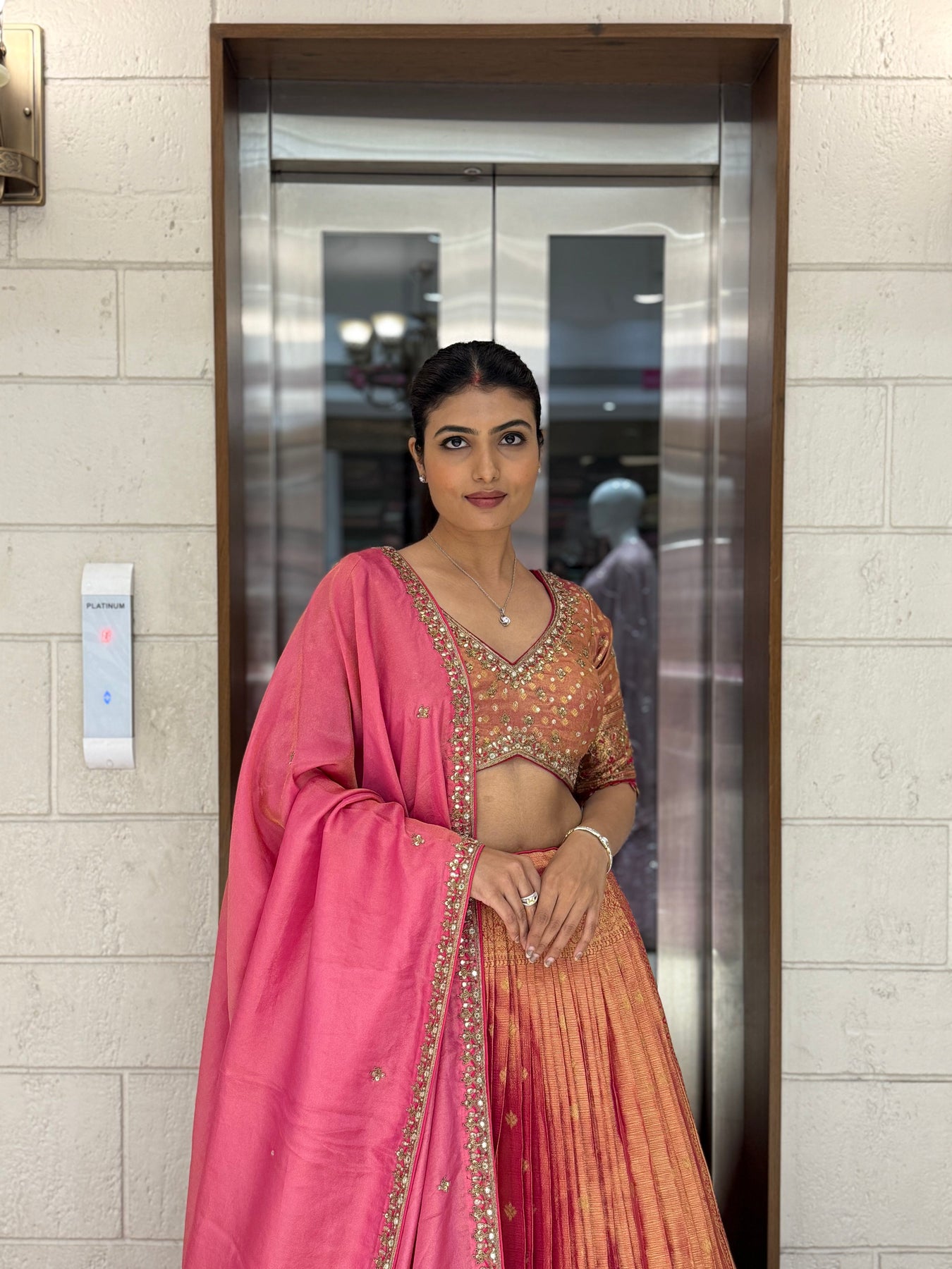 The lehenga features a luxurious silk base in an ombré gradient of peach and pink, highlighted with intricate mirror, zari, and thread embroidery across the blouse and border. The skirt’s fluid pleats shimmer with every movement, creating an ethereal look perfect for both daytime and evening celebrations.
