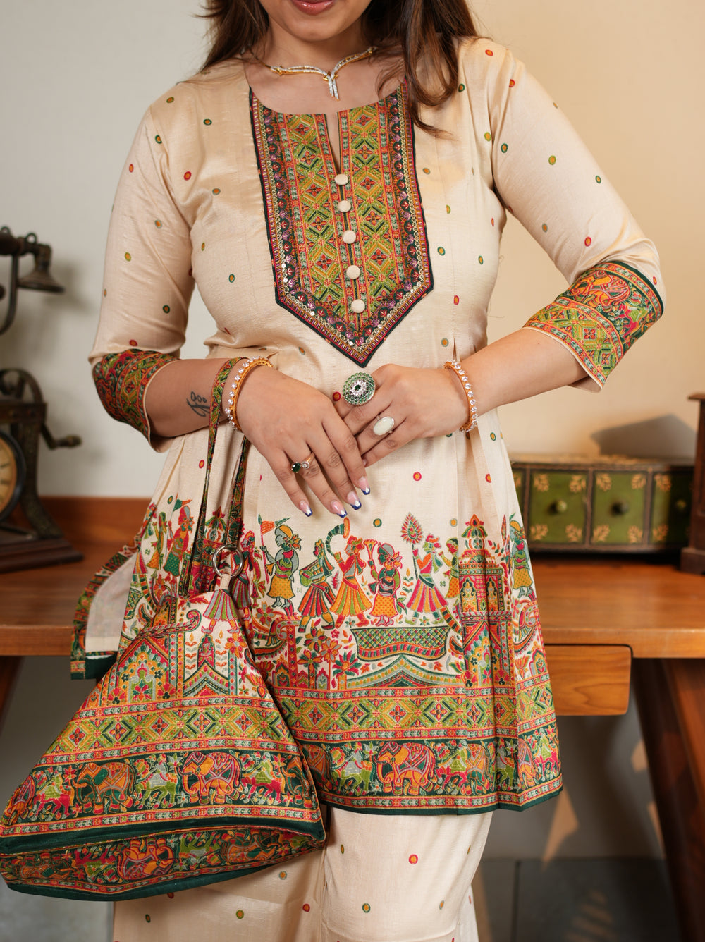 Step into timeless tradition with our Cream Multicolor Ethnic Suit Set, adorned with vibrant folk-inspired prints and embroidery. Designed to reflect cultural charm with a modern twist, this elegant set is perfect for festive and special occasions.