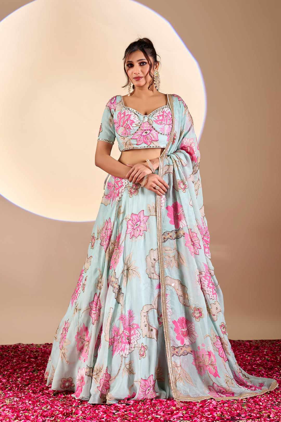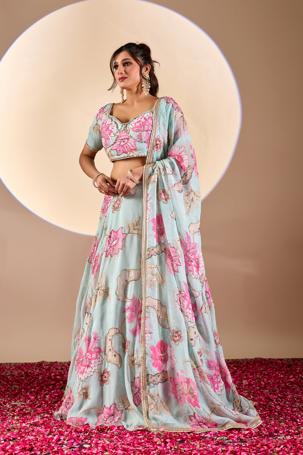 Pastel Blue Floral Printed Lehenga Set with Dupatta