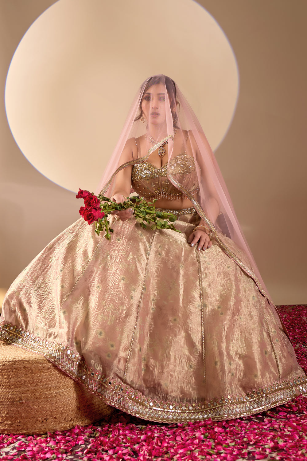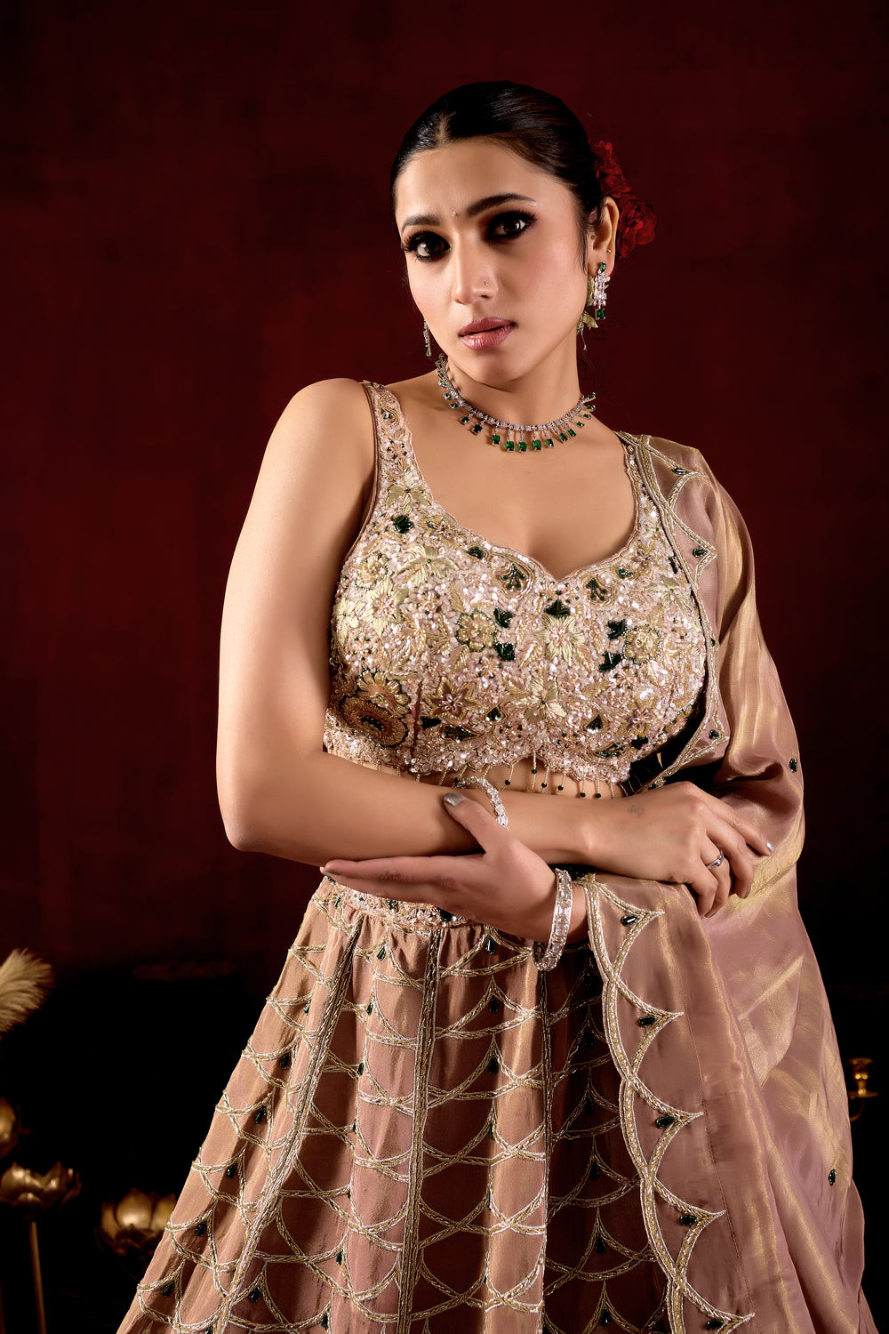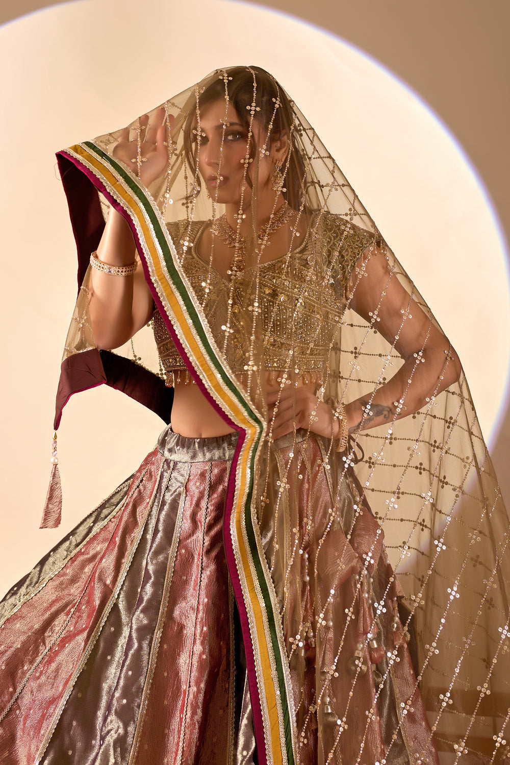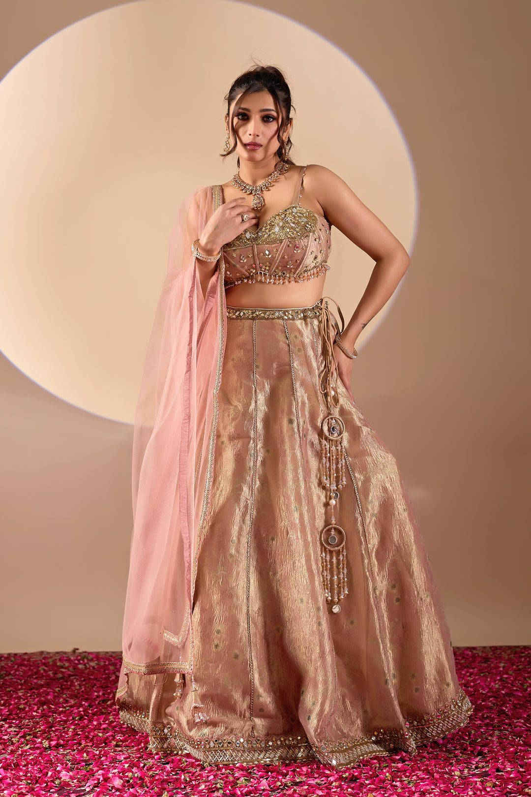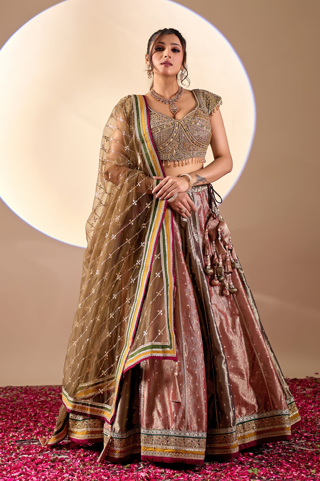 Bronze Metallic Lehenga Set with Embellished Blouse & Net Dupatta