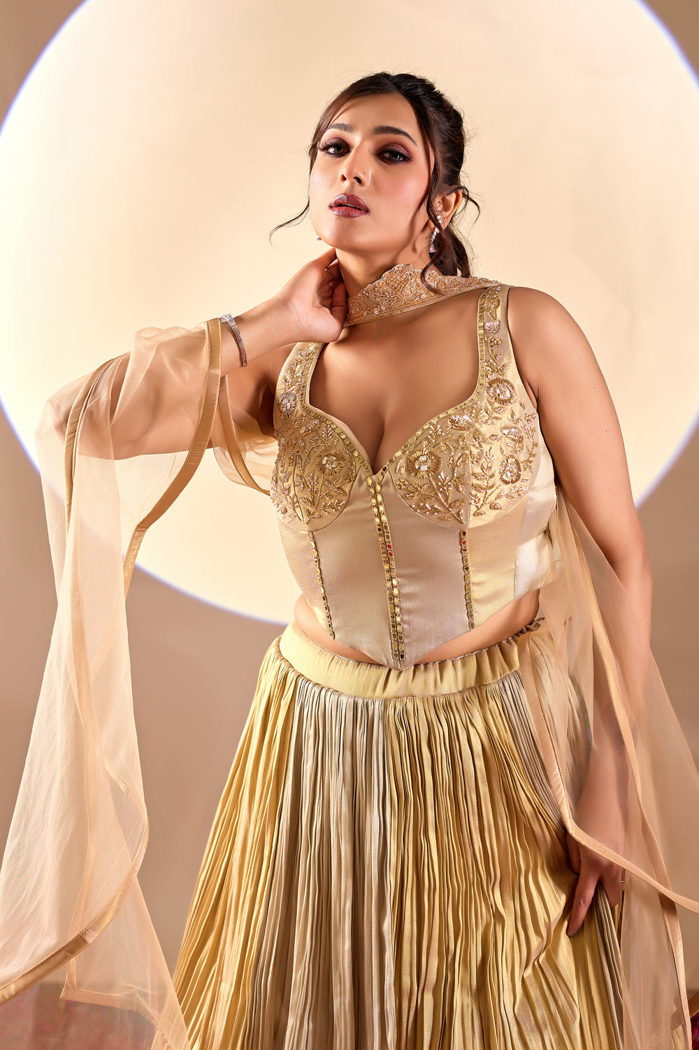 Golden Pleated Indo-Western Lehenga Set with Dupatta