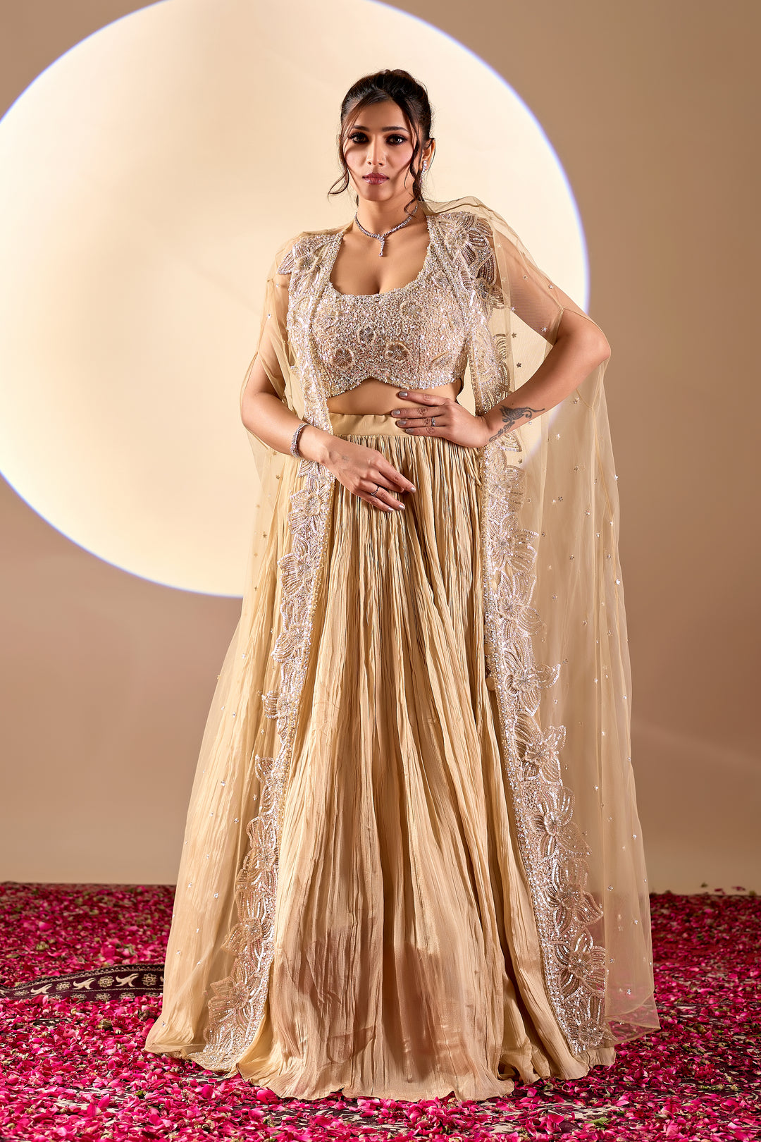 Champagne Gold Designer Lehenga Set with Embellished Cape Dupatta