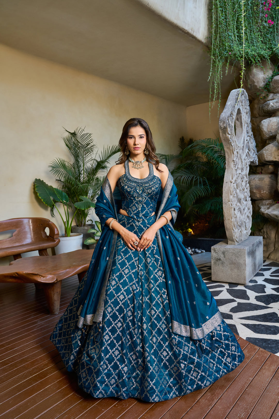 Royal Teal Blue Designer Lehenga Set with Silver Embroidery & Dupatta