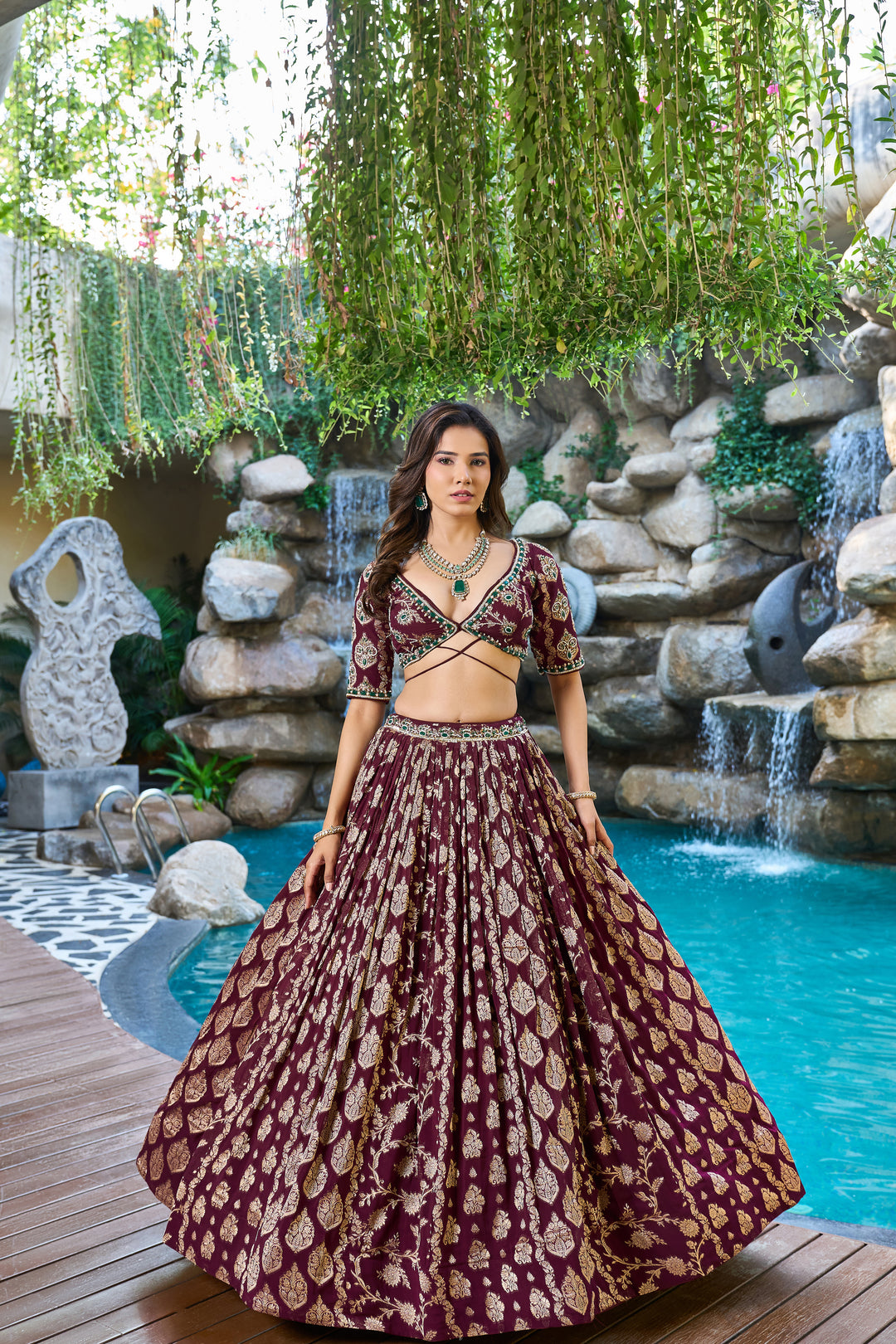 Wine Purple Designer Lehenga Set with Gold Brocade Work & Tie-Up Blouse
