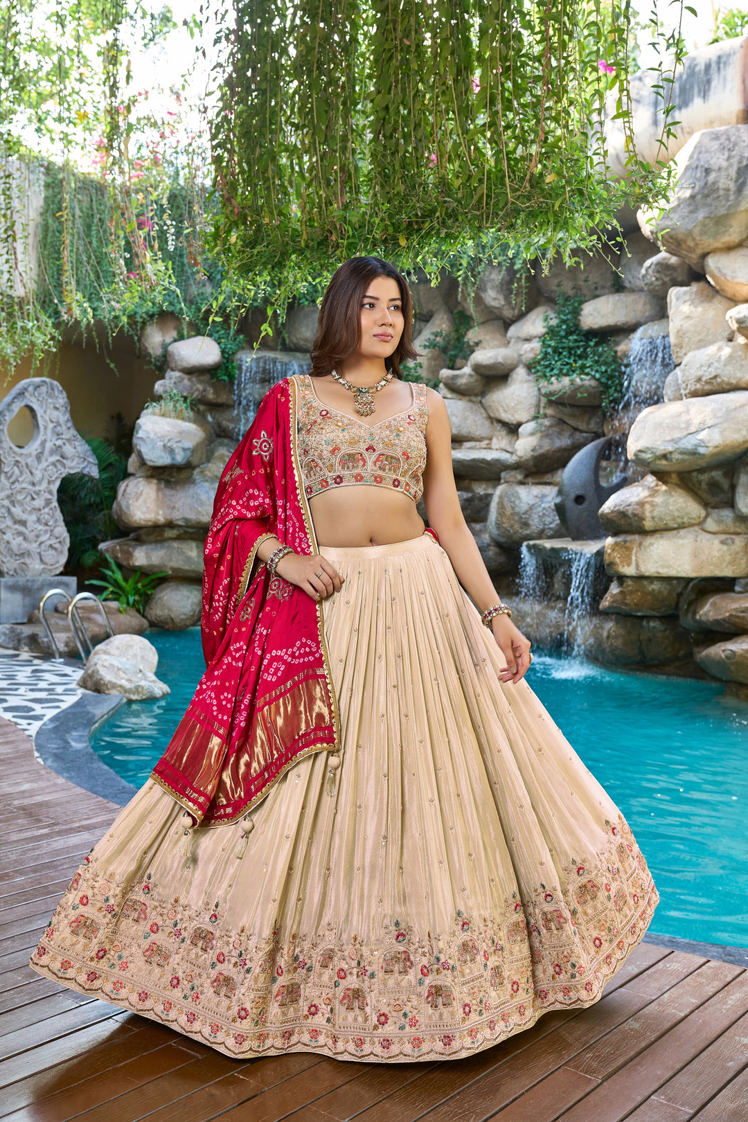 lvory Cream Designer Lehenga Set with Embroidered Blouse & Red Dupatta