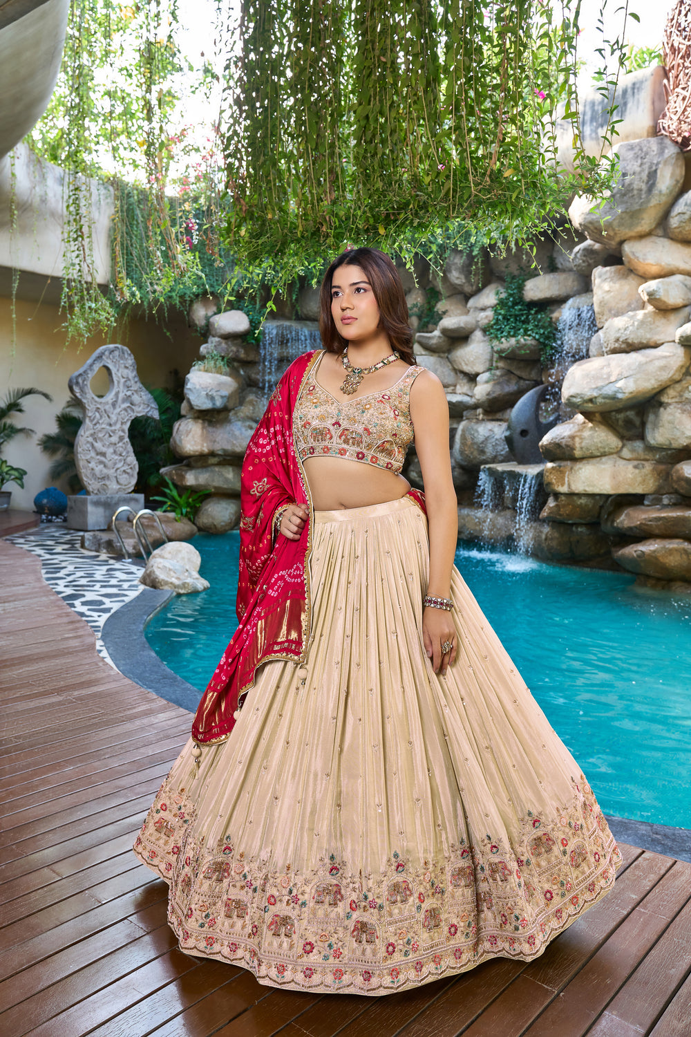 Champagne Beige Designer Lehenga Set with Embellished Blouse & Dupatta