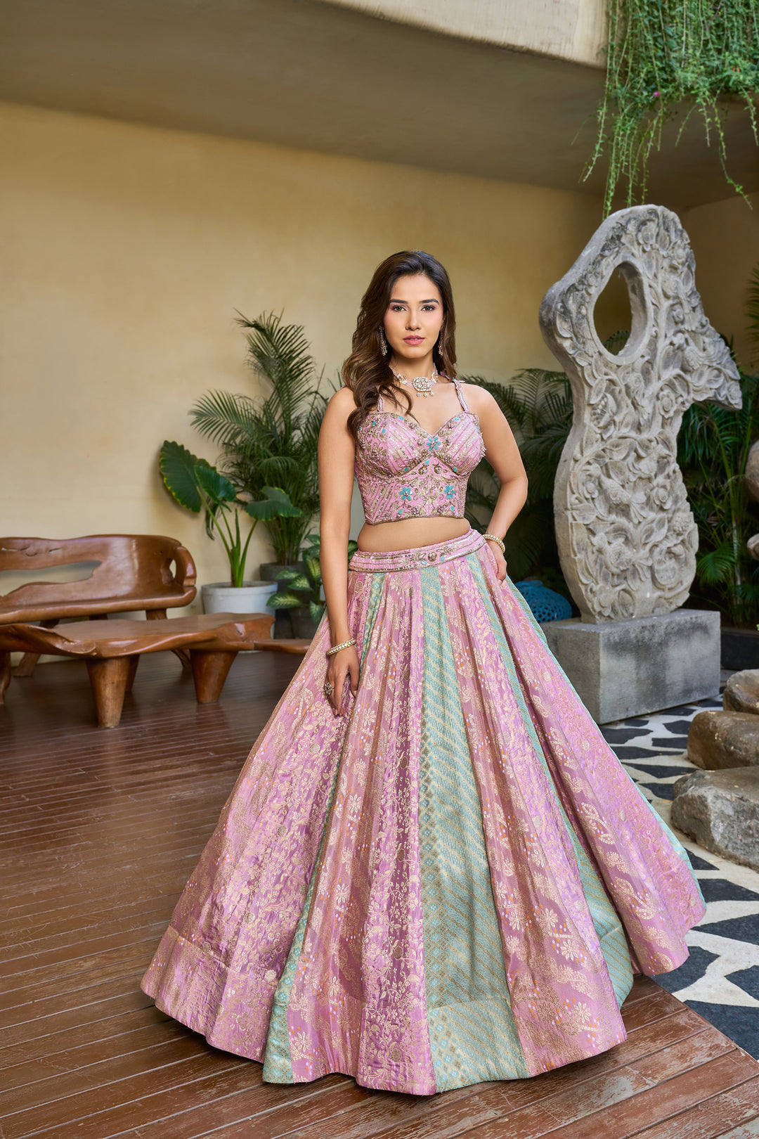 Pastel Pink Designer Lehenga Set with Mint Panels & Embellished Blouse