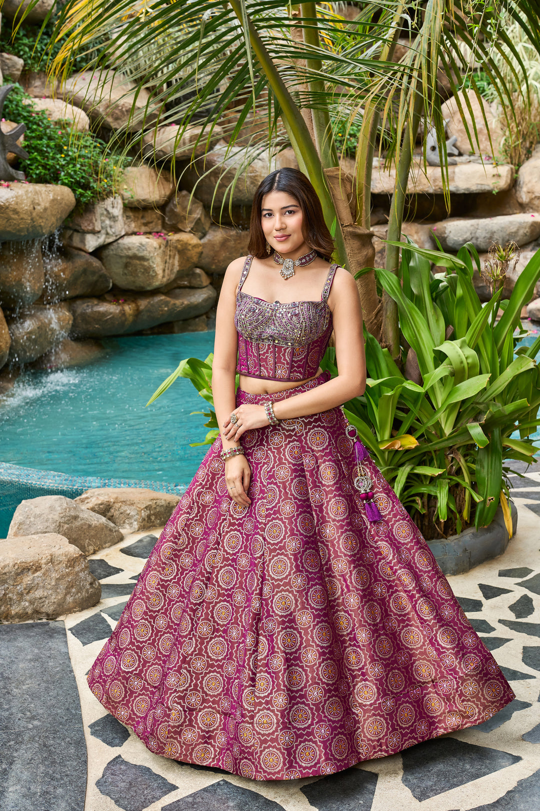 Magenta Purple Designer Lehenga Set with Mirror Embellished Blouse & Printed Skirt