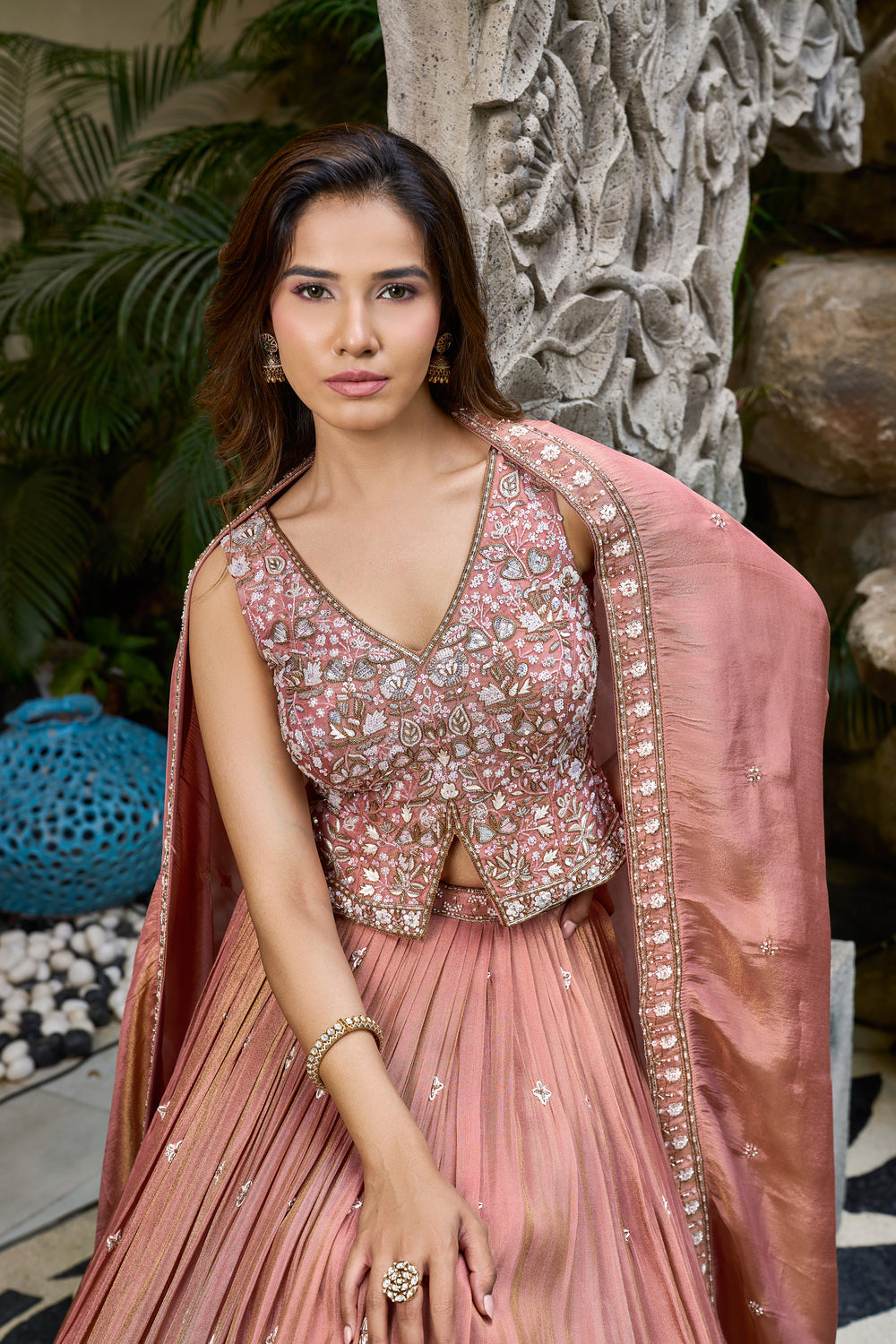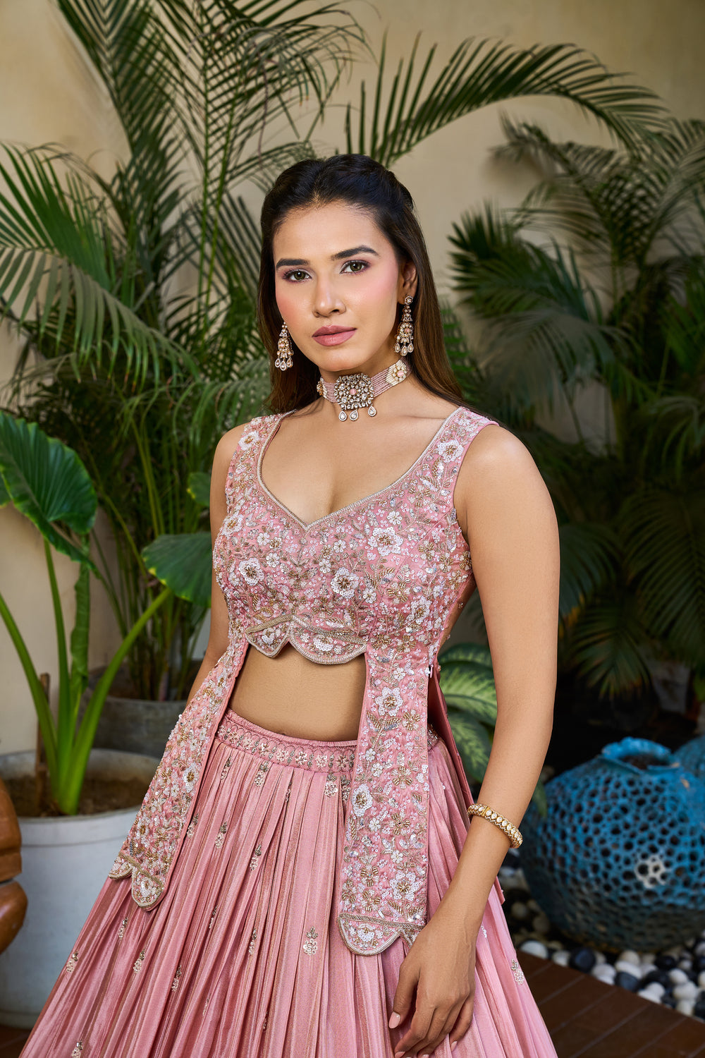 Dusty Rose Hand-Embroidered Designer Lehenga Set with Floral & Mirror Work