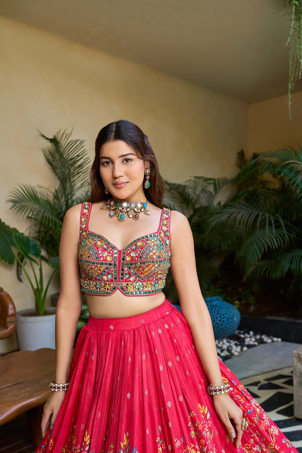 Crimson Red Multicolour Printed Designer Lehenga Set with Embellished Blouse & Dupatta