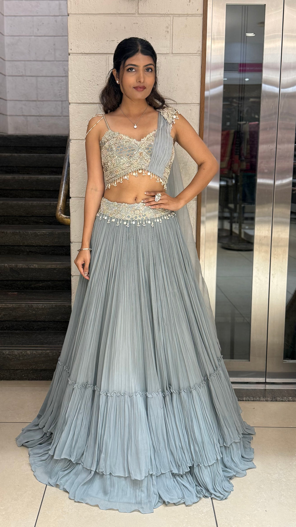 Make a graceful statement with this Ice Blue Designer Lehenga Set, crafted for modern celebrations with a soft romantic appeal. The lehenga features a flowy, pleated silhouette that moves beautifully with every step, creating an effortlessly elegant look.