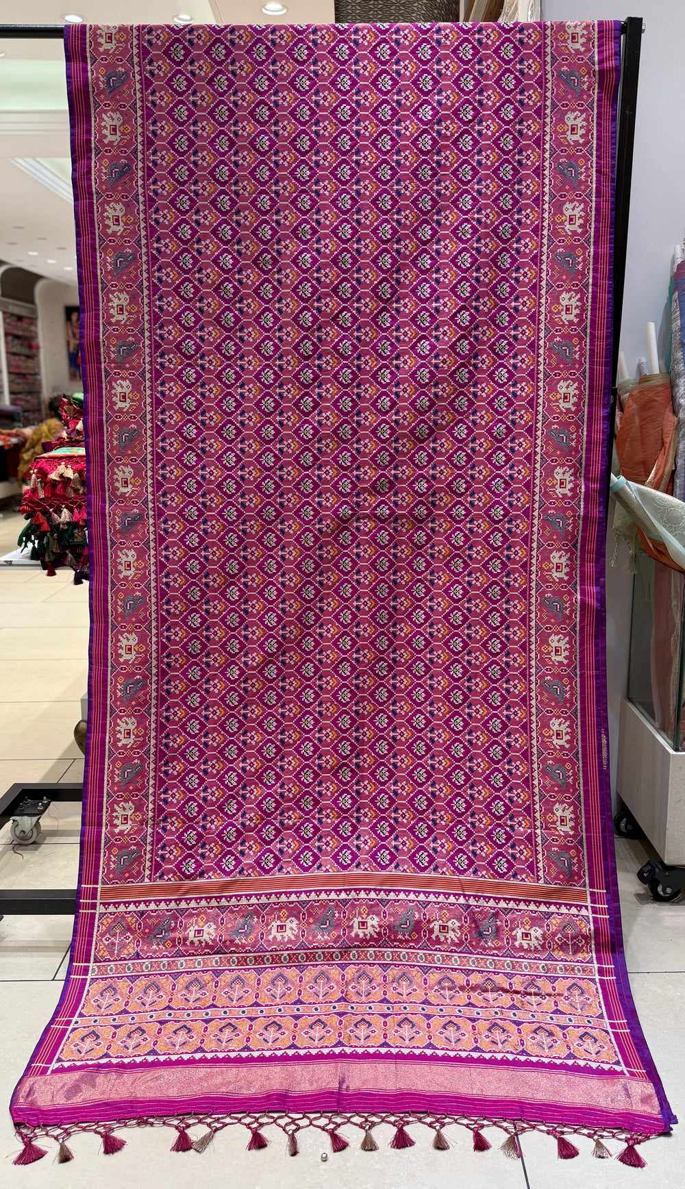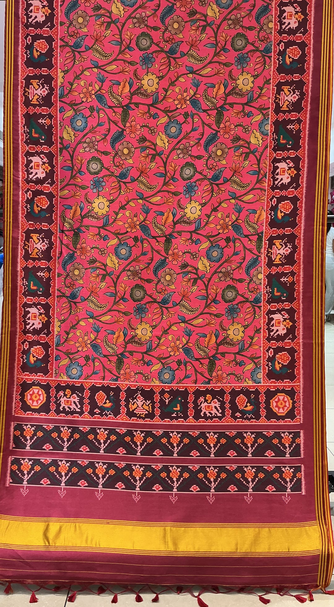 Vibrant Pink Floral Patola Inspired Silk Saree with Traditional Animal & Bird Border p149