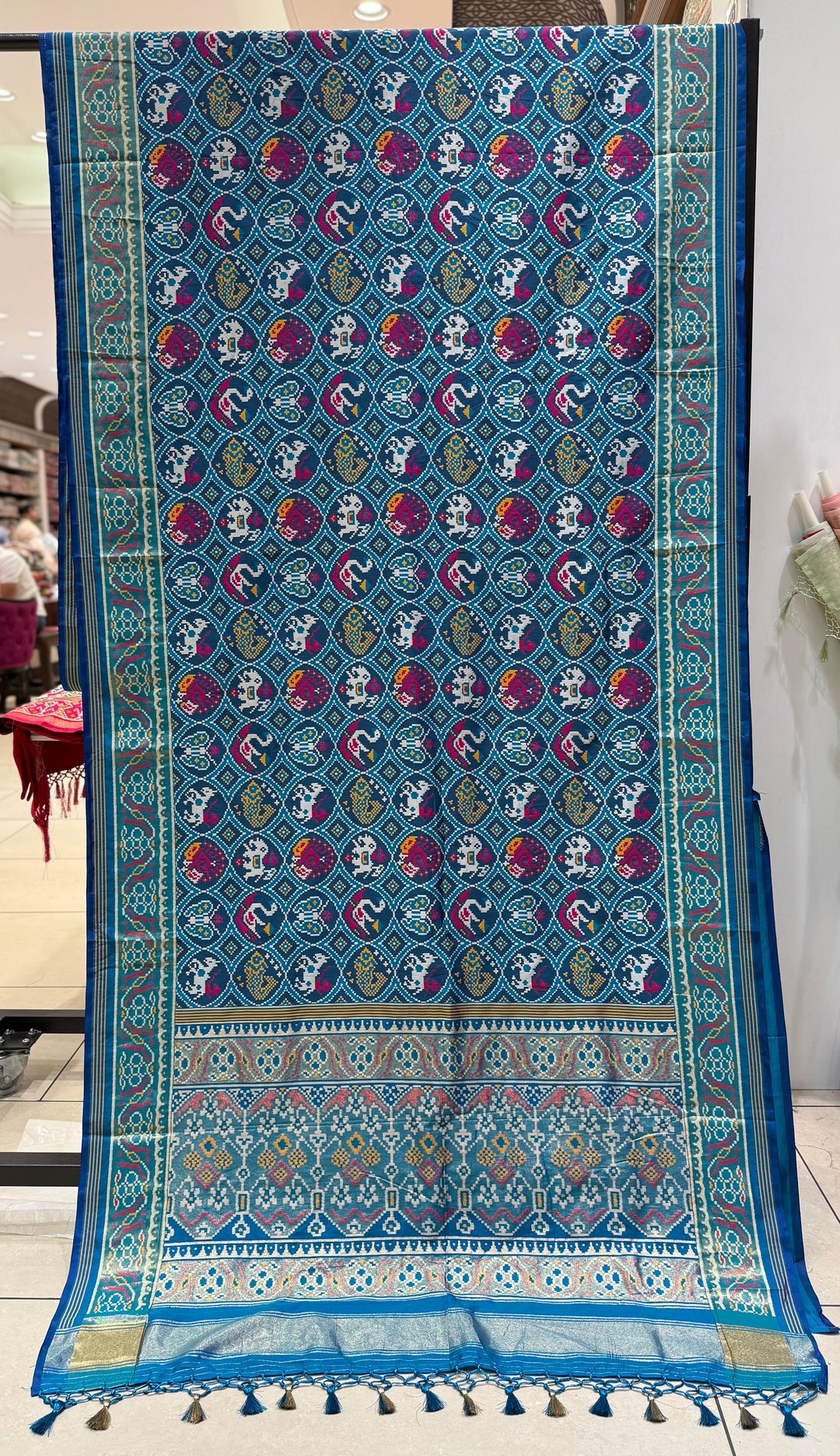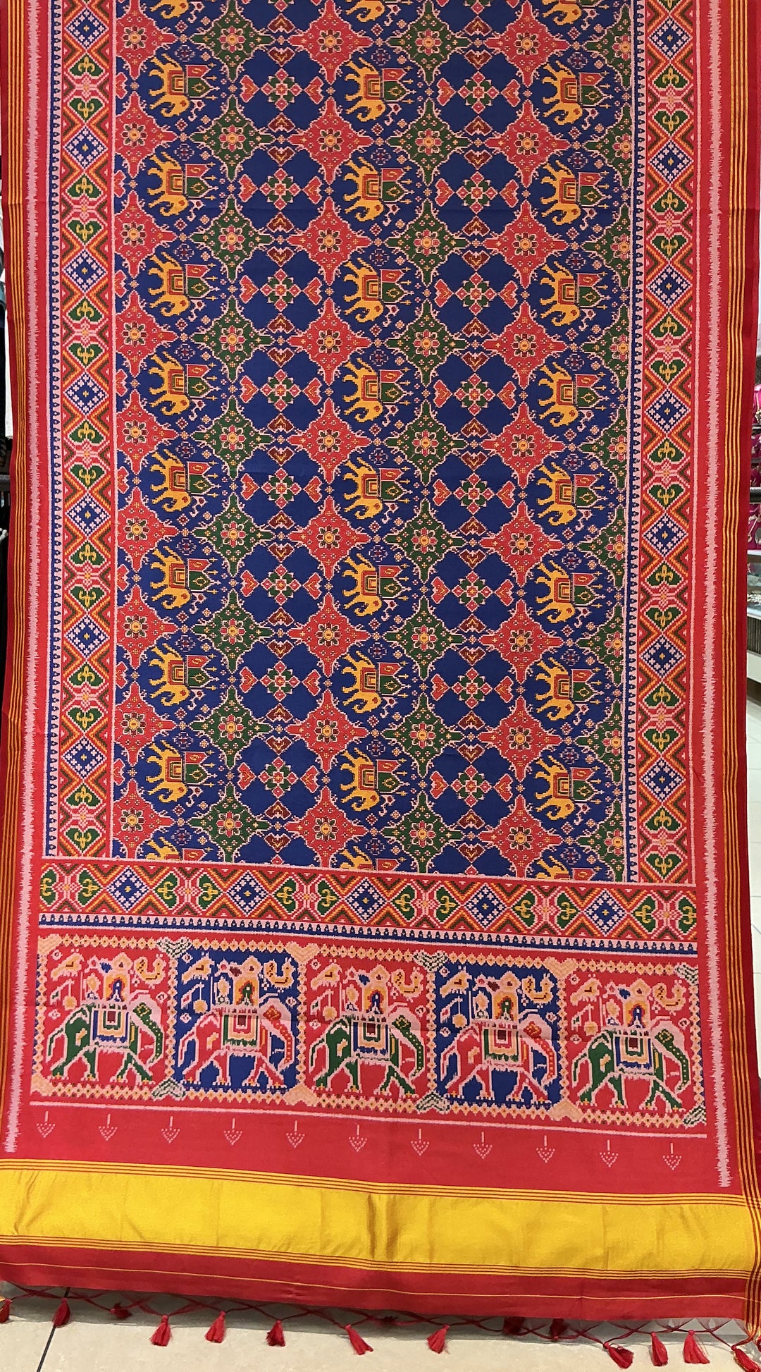 Royal Blue Kunjar Bhat Patola Inspired Silk Saree with Elephant Border & Chowkdi Weave p376