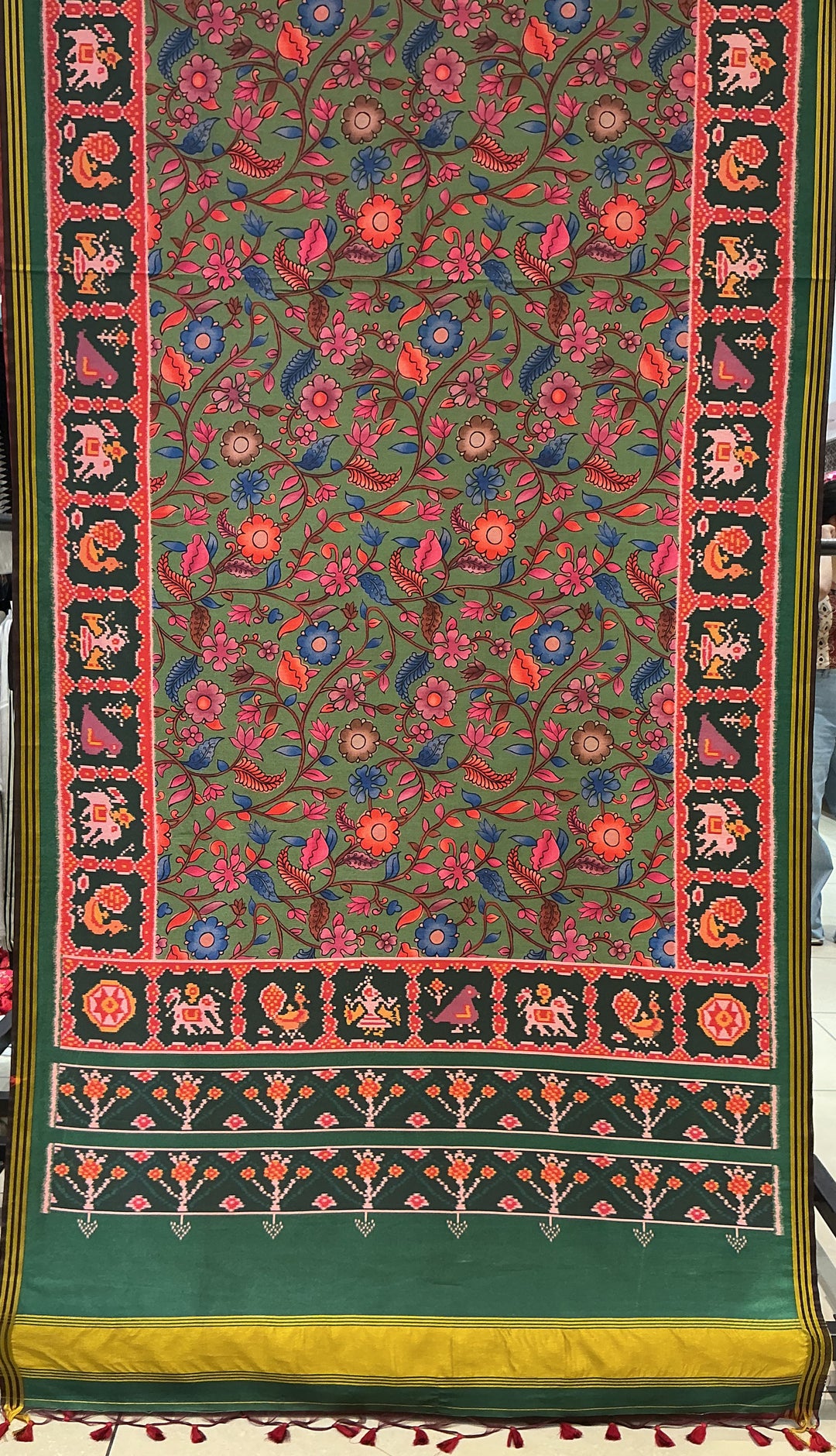 Bottle Green Floral Patola Inspired Silk Saree with Traditional Animal & Bird Border p150