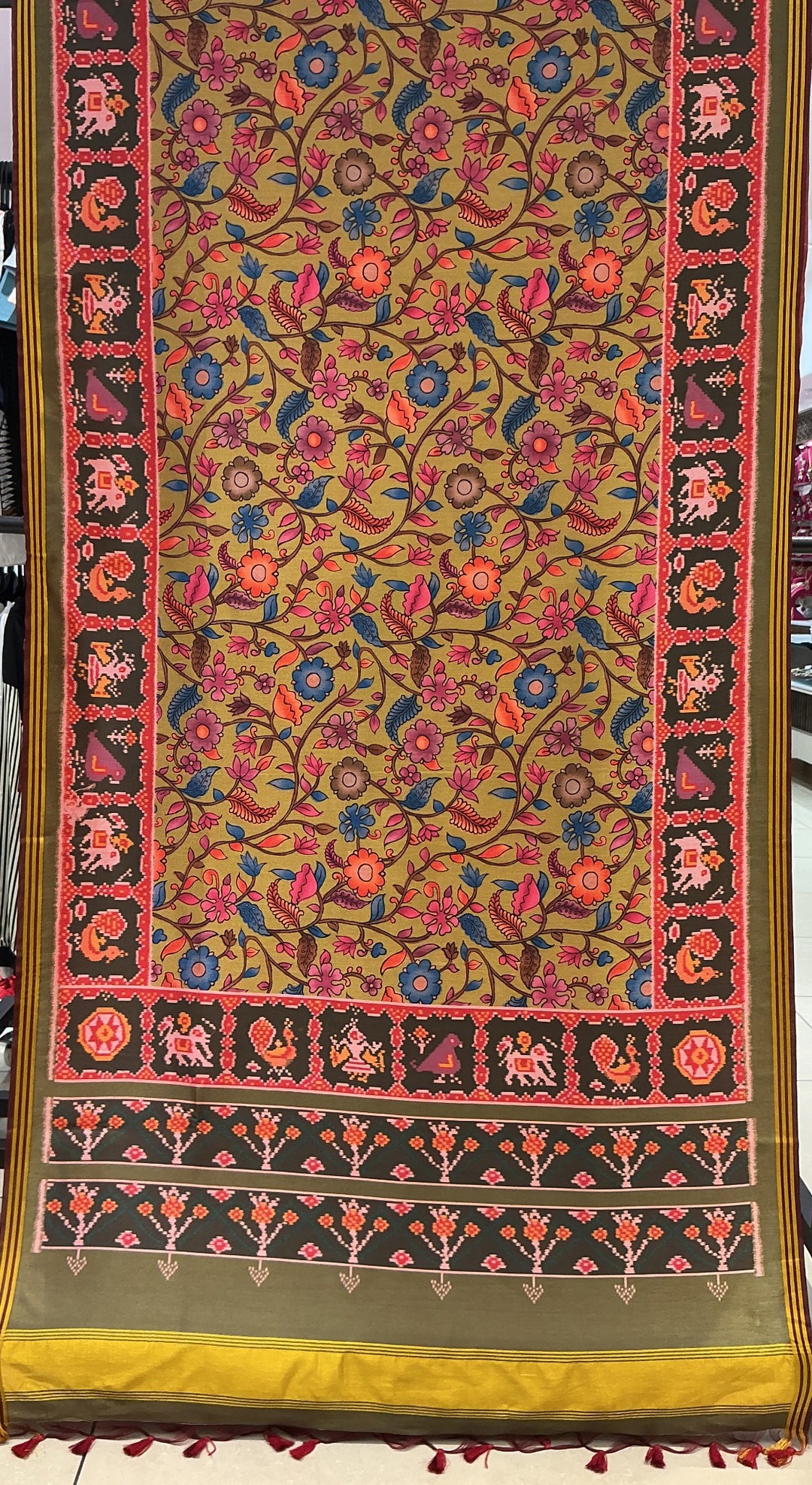 Olive Green Floral Patola Inspired Silk Saree with Traditional Animal & Bird Border p151