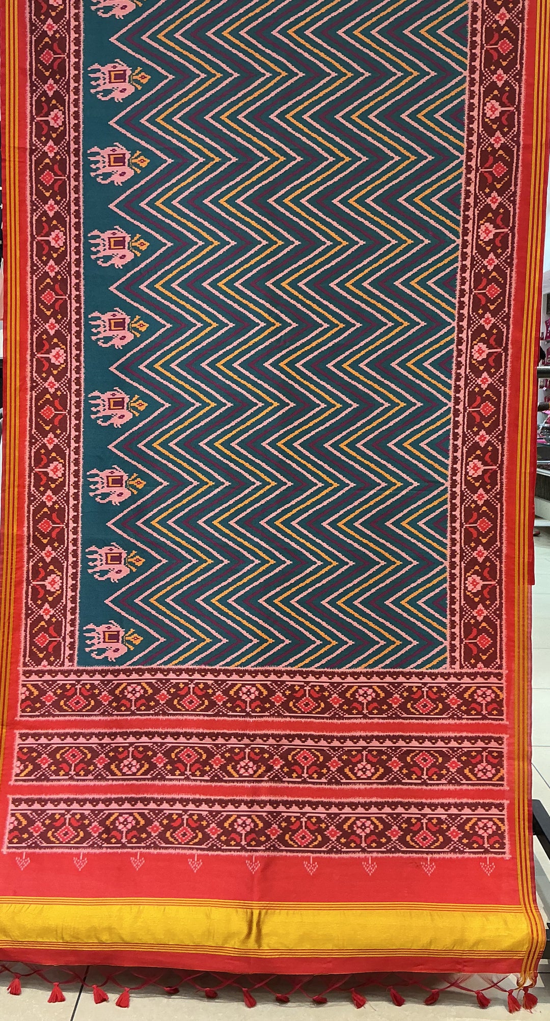 Teal Chevron Patola Inspired Silk Saree with Elephant Motif Border p239