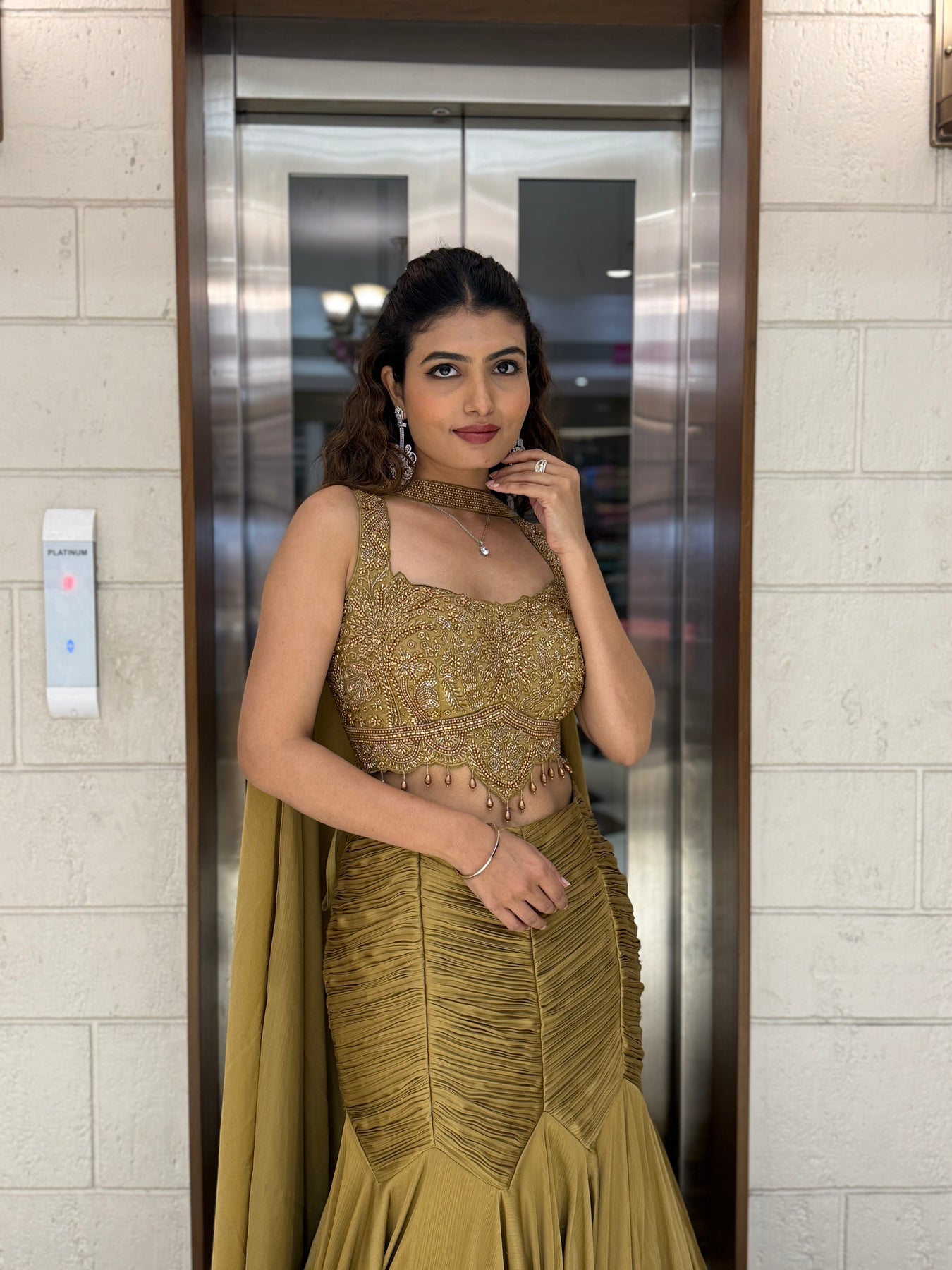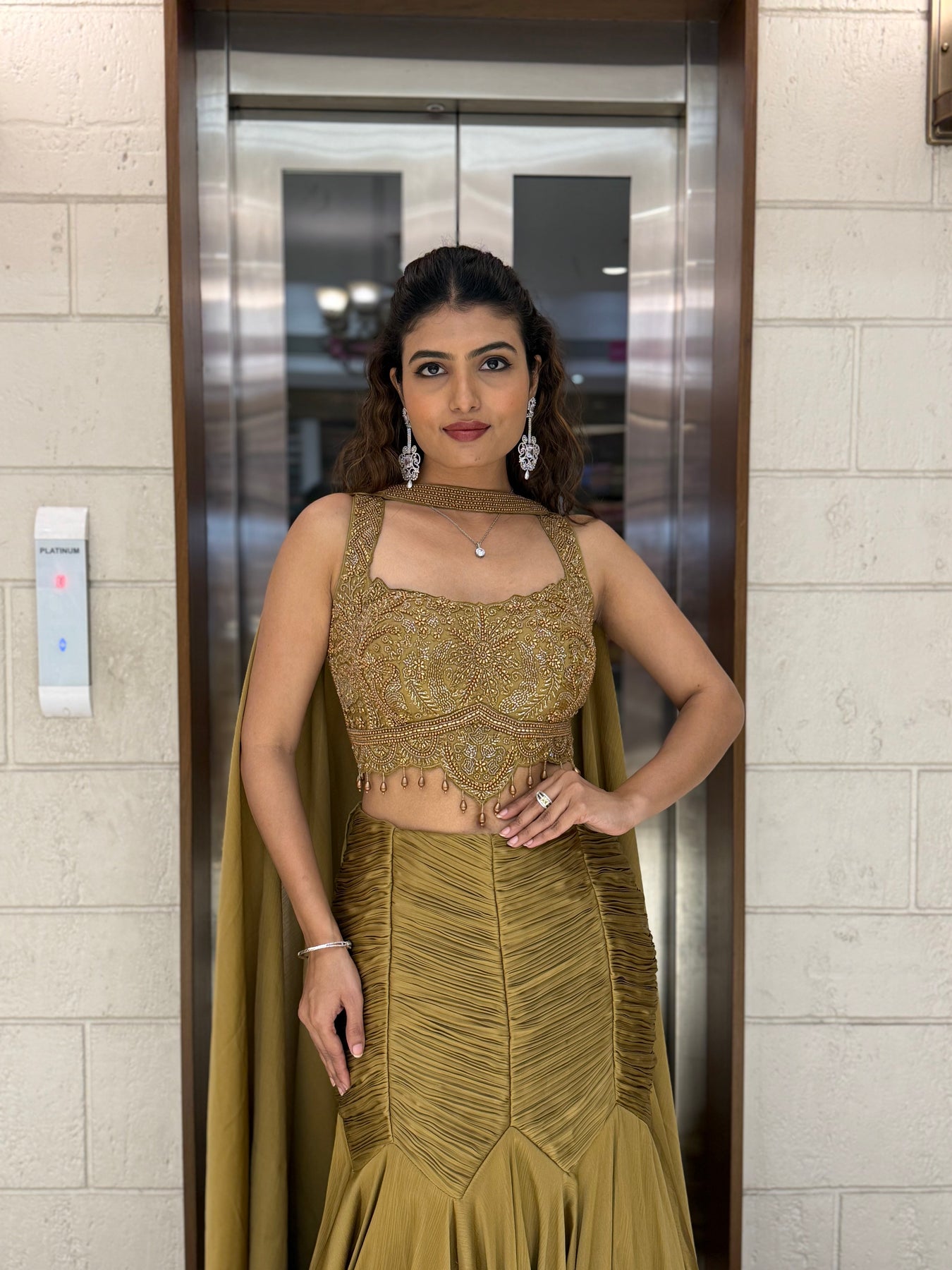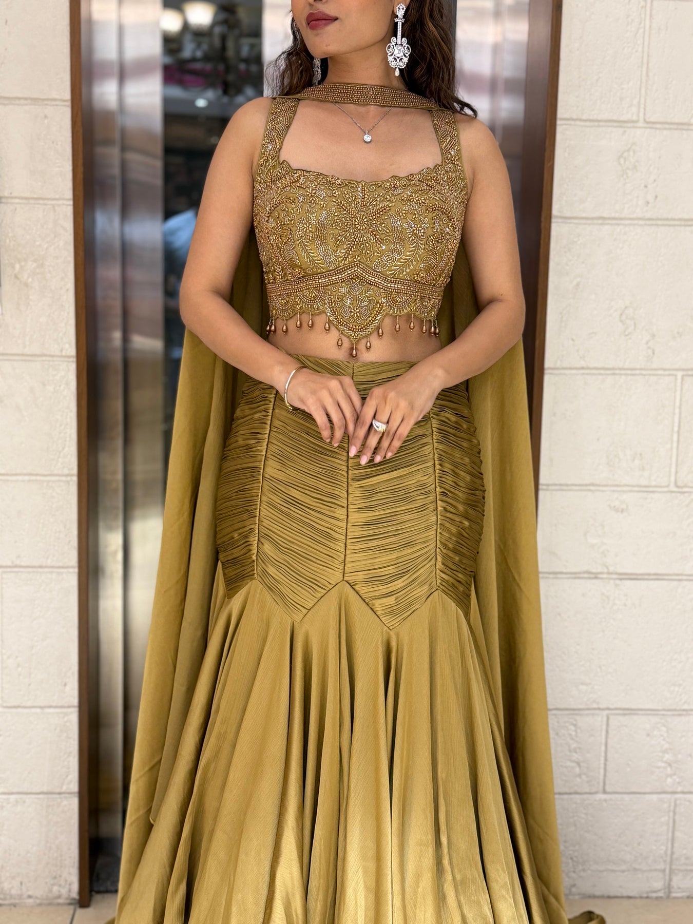 Antique Gold Indo-Western Mermaid Gown with Handcrafted Beaded Corset & Flowing Cape