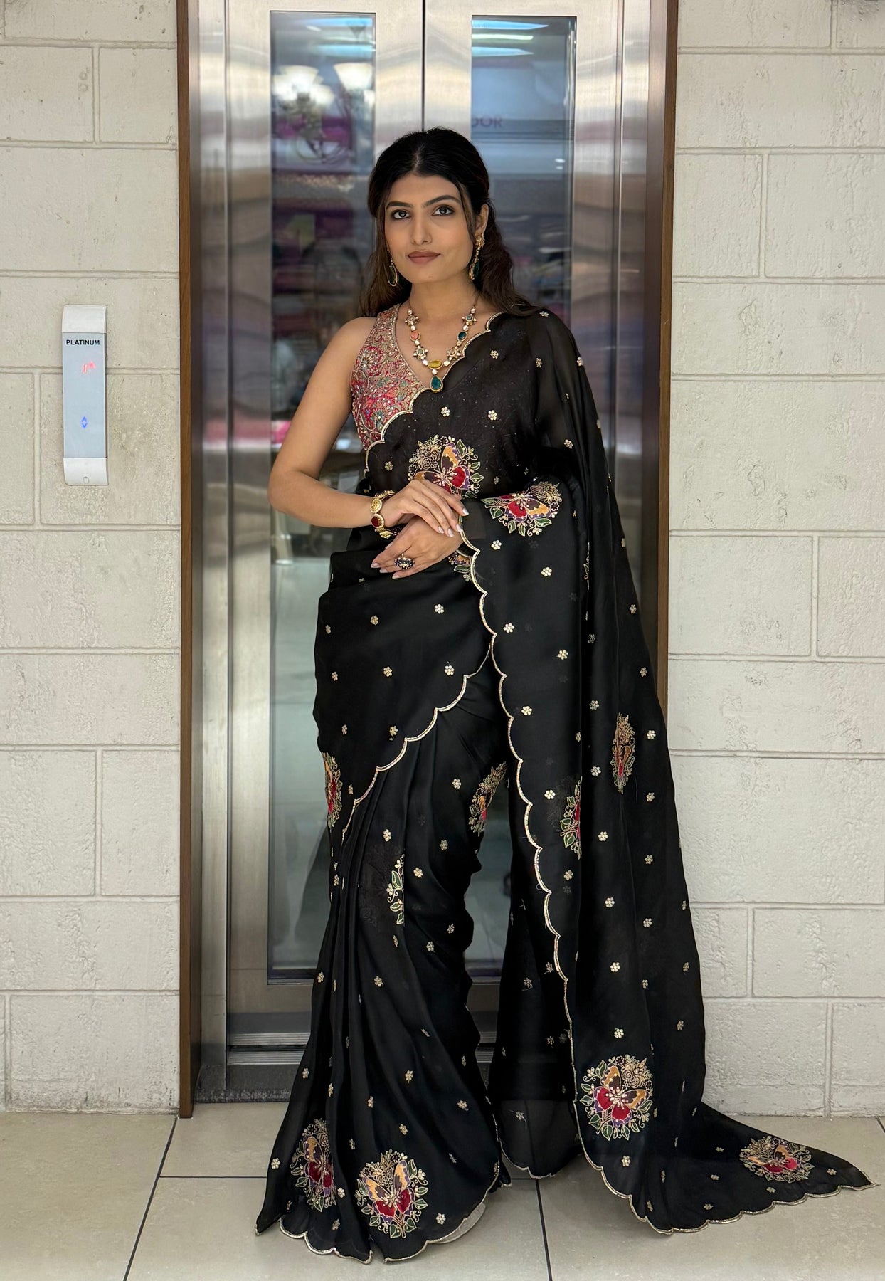 Black Organza Saree with 3D Floral Hand Embroidery & Scalloped Border