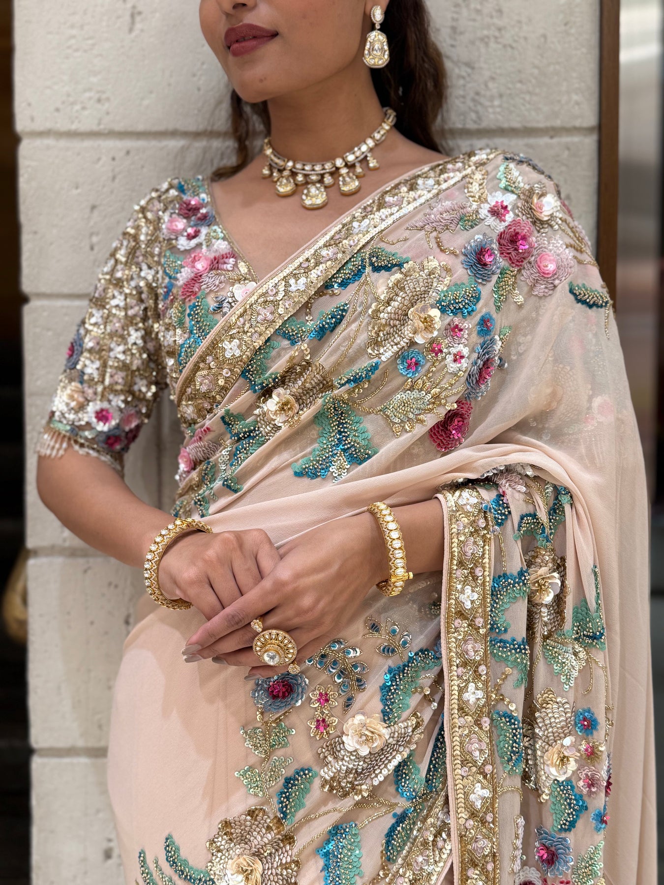 Step into effortless elegance with this stunning blush pink designer saree, beautifully crafted with intricate multicolour floral embroidery, sequins, and shimmering threadwork. The soft pastel tone paired with rich handcrafted detailing gives the saree a luxurious appeal ideal for both day and evening occasions.