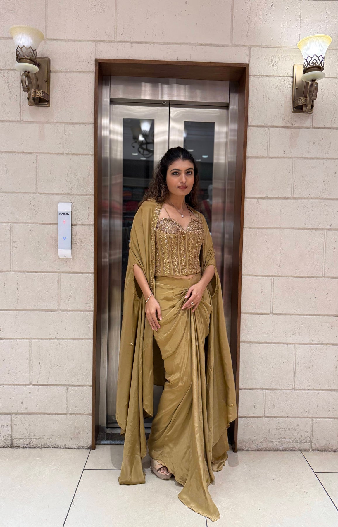 Champagne Gold Draped Saree Set with Embroidered Corset Blouse & Cape
