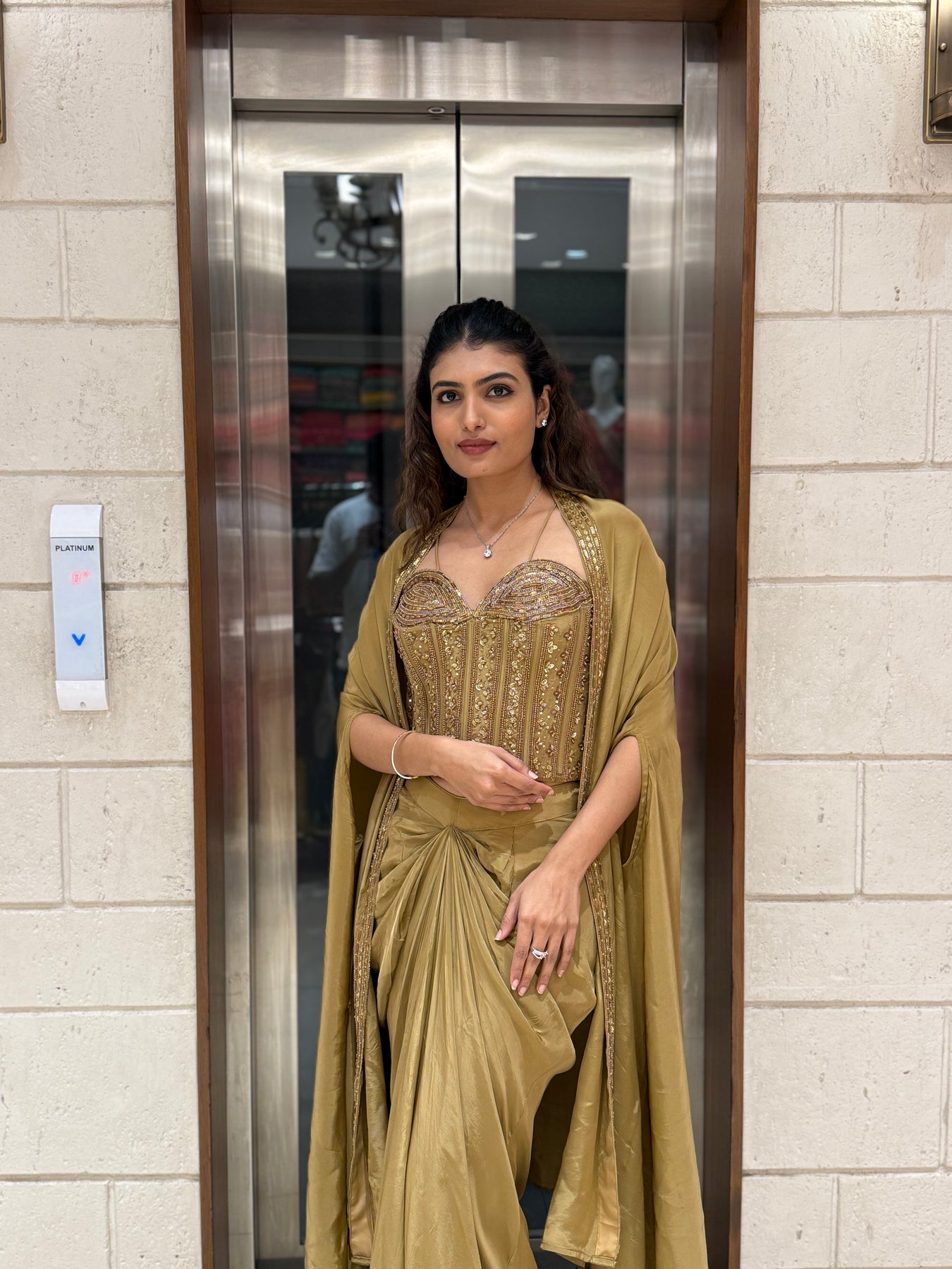 A flowy cape dupatta adds a contemporary twist, making this outfit perfect for cocktail parties, sangeet nights, or festive soirées. The soft, metallic gold fabric drapes beautifully, exuding sophistication and grace in every movement.
