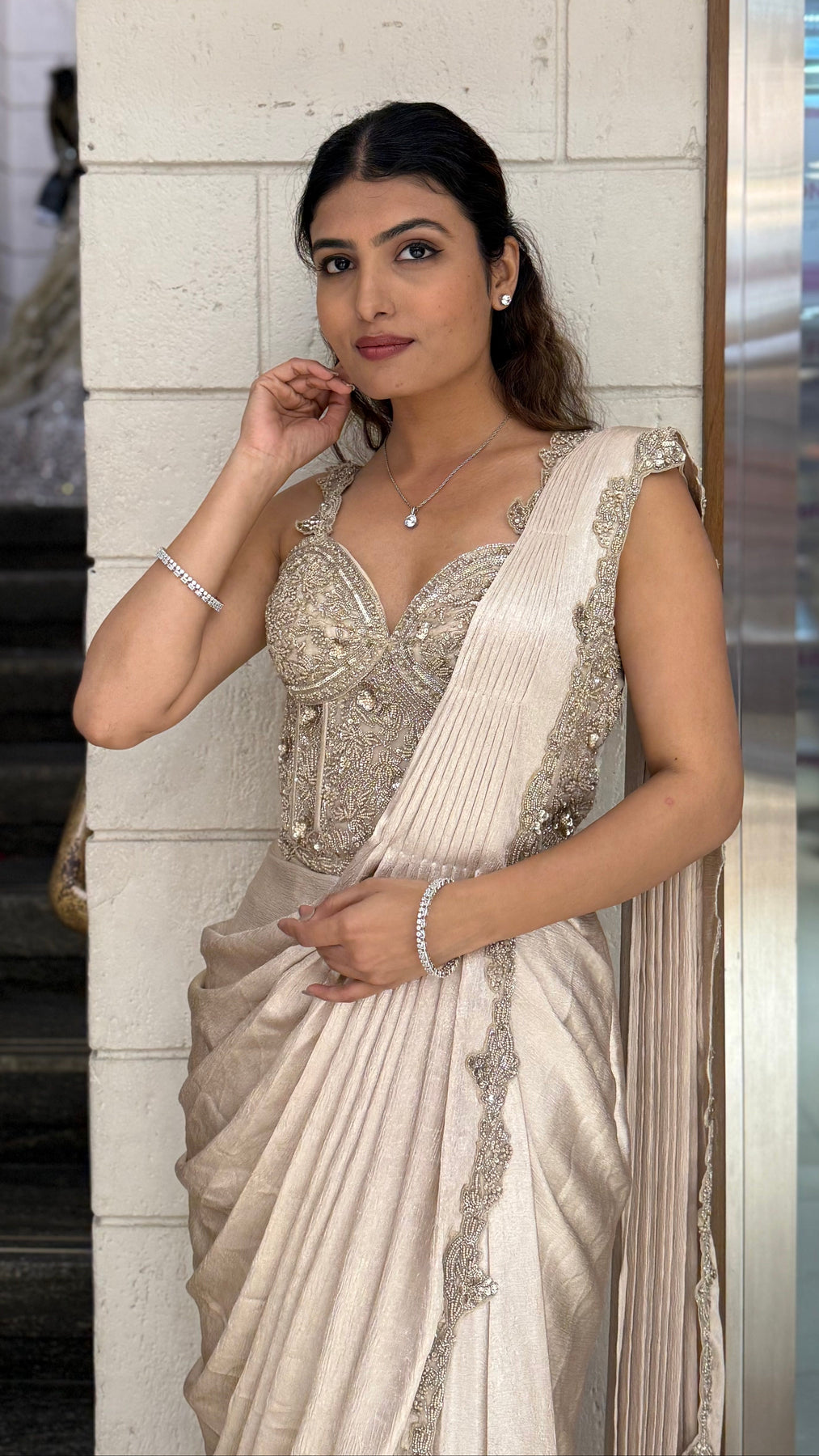 Champagne Gold Ready-to-Wear Draped Saree with Heavy Embellished Blouse