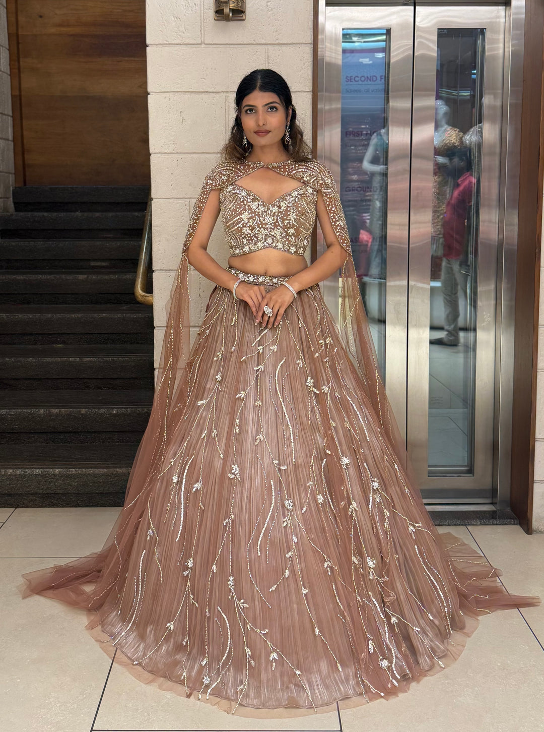 Exude modern bridal glamour with this Champagne Gold Designer Lehenga Set, crafted for statement celebrations and luxe occasions. The lehenga features dense all-over sequin and bead embroidery that creates a radiant shimmer and elegant movement with every step.