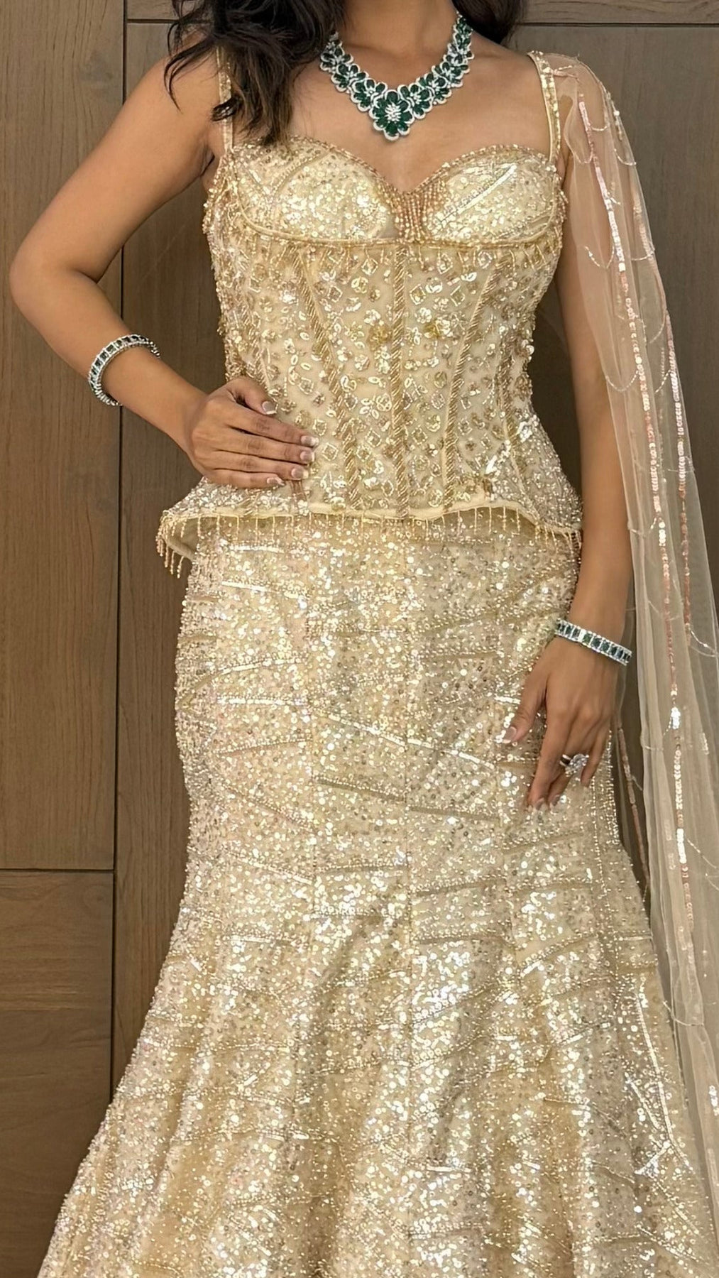 Champagne Gold Sequin Embellished Designer Lehenga Set with Corset Blouse & Sheer Net Dupatta