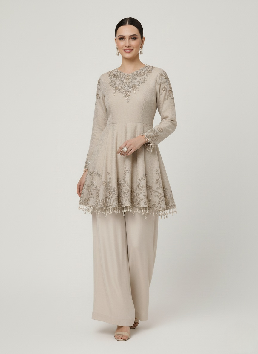Step into graceful sophistication with this beautifully designed beige peplum kurti and palazzo set, crafted for women who appreciate subtle elegance with modern ethnic styling.