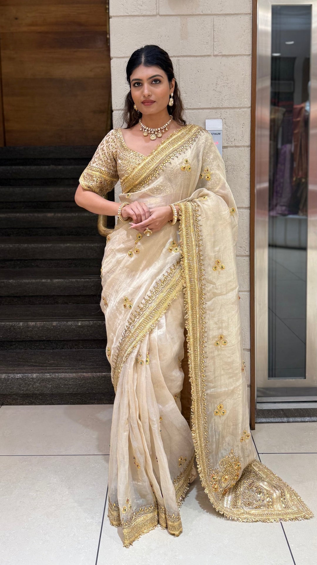 Elevate your festive elegance with this exquisite beige and gold designer saree featuring rich hand-embellished detailing. The lightweight fabric paired with intricate zari work creates a luxurious drape that beautifully enhances every silhouette.