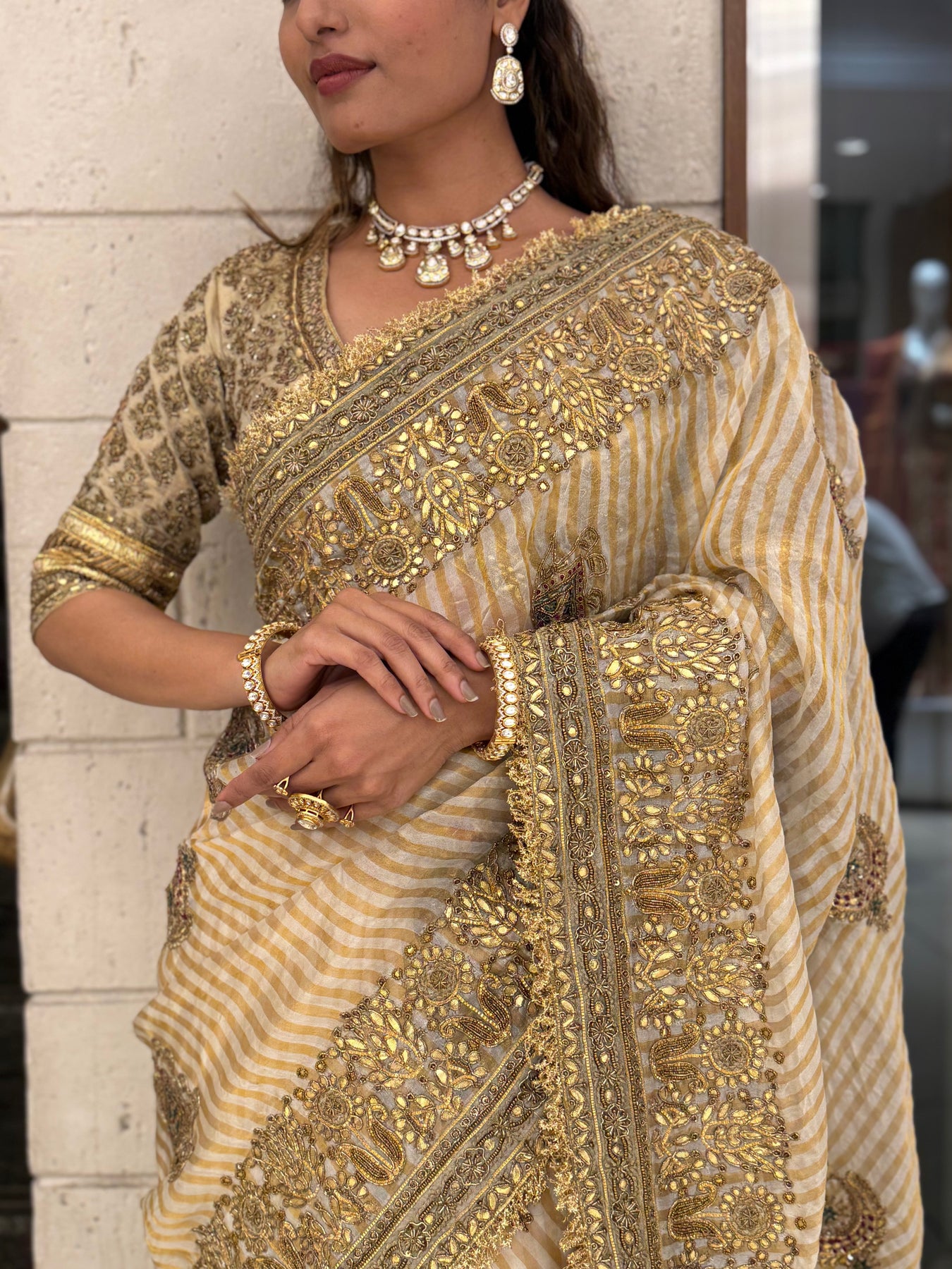 Elegant Beige & Gold Hand-Embellished Designer Saree with Heavy Zari Border
