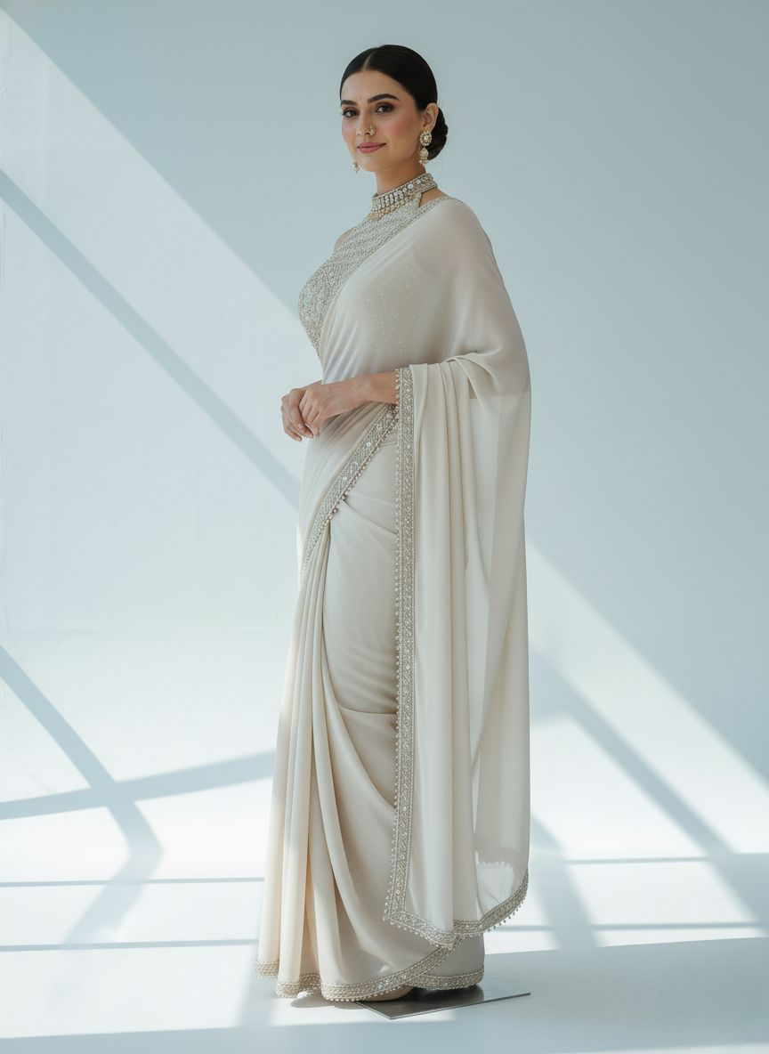 Elegant Ivory Ready-to-Wear Saree with Heavy Hand-Embellished High-Neck Blouse