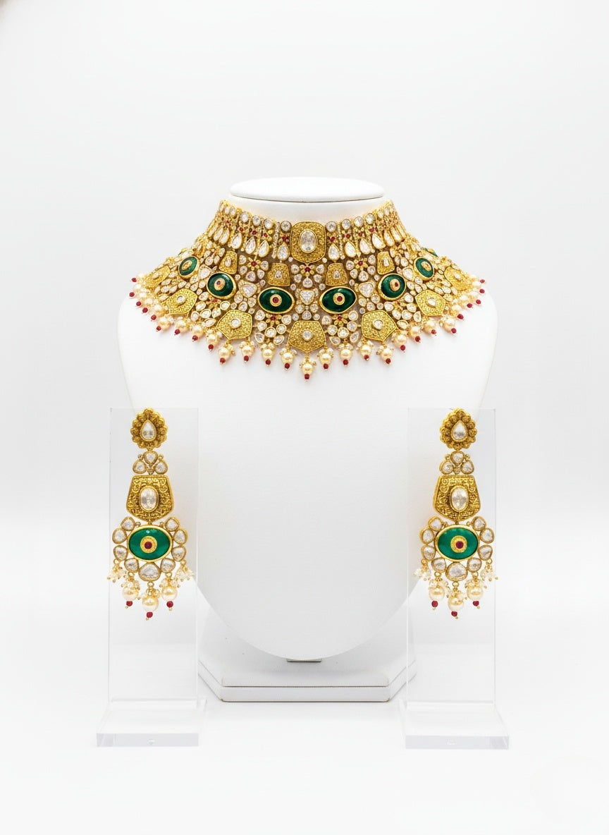 The bold green enamel oval motifs add richness, while the elegant arrangement of pear-shaped Kundan stones creates a breathtaking layered effect. Finished with delicate pearls and red bead droplets, this piece beautifully enhances any bridal or festive attire.