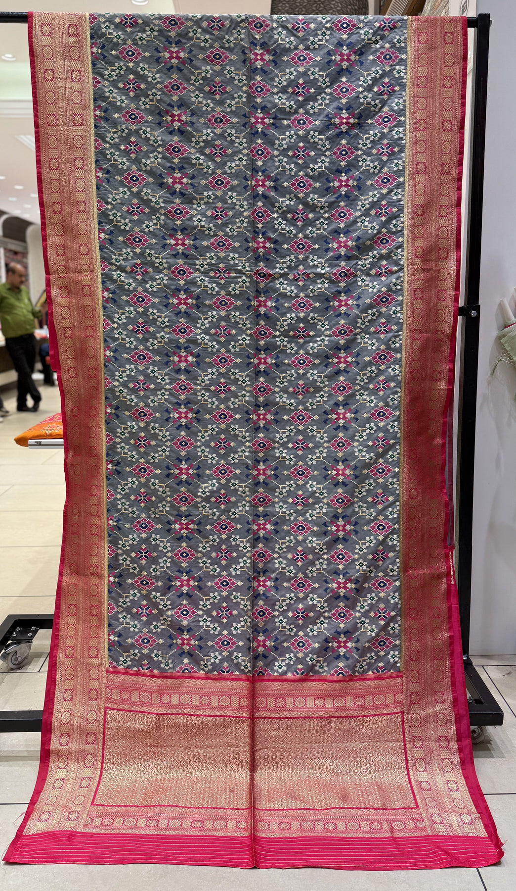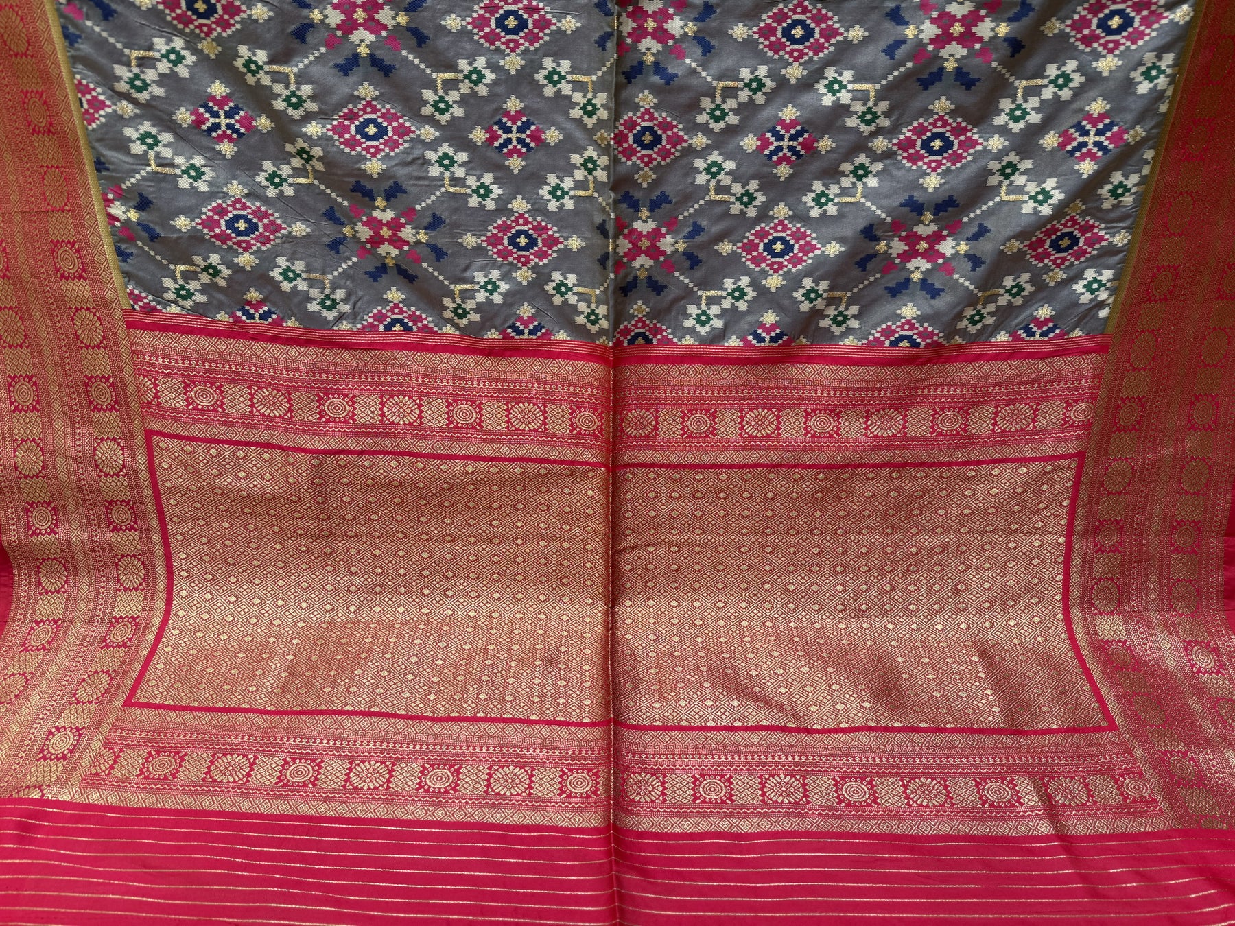 Product Name: Royal Grey Chowkdi Bhat Patola Saree with Phool Jaal
