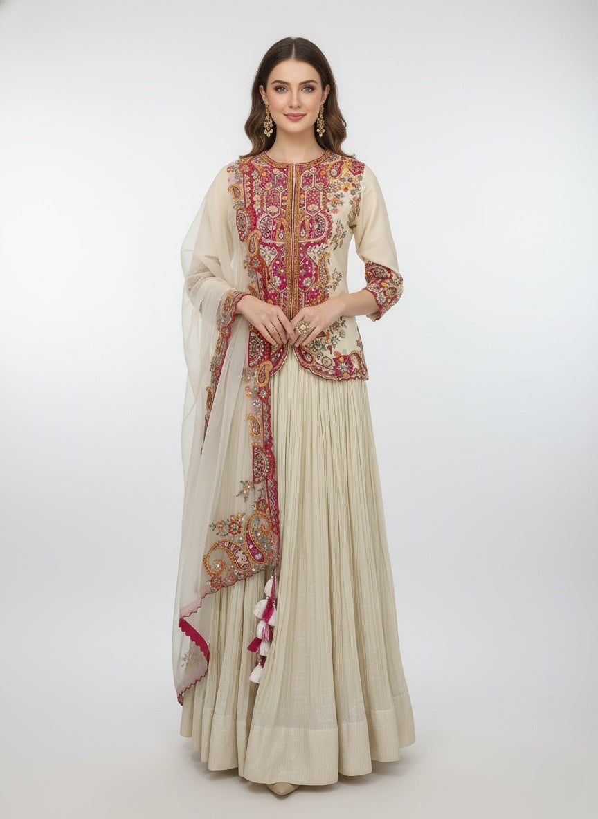 Step into timeless elegance with this beautifully crafted ivory top and pleated lehenga set, designed to blend traditional charm with graceful modern styling. The structured top features intricate multicolor paisley and floral embroidery inspired by classic Indian motifs, elegantly placed along the neckline, sleeves, and hemline for a rich ethnic appeal.