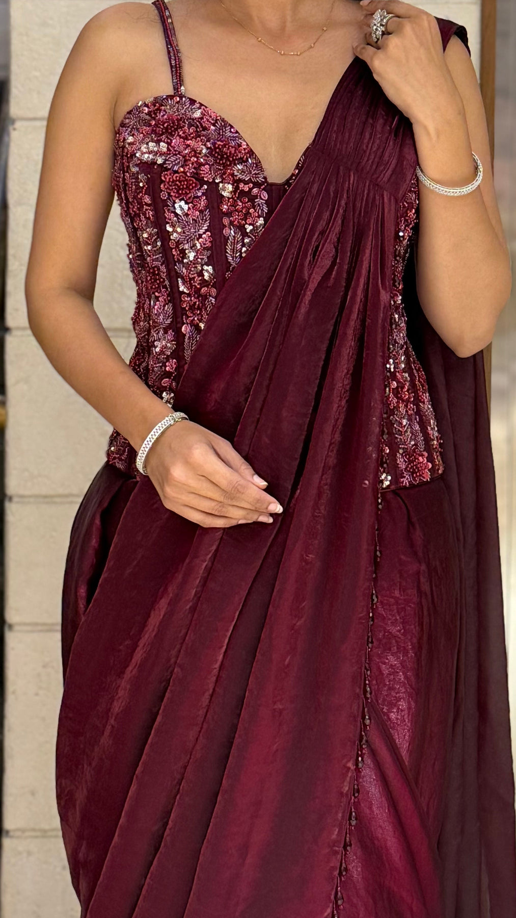 Maroon READY TO WEAR Pre-Draped Saree with Sequin-Embroidered Strappy Blouse