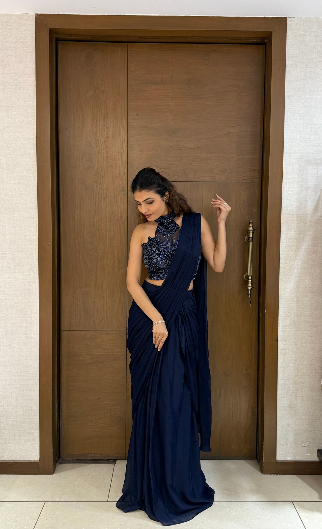 Navy Blue Ready-to-Wear Saree with Embroidered Blouse – Midnight Grace