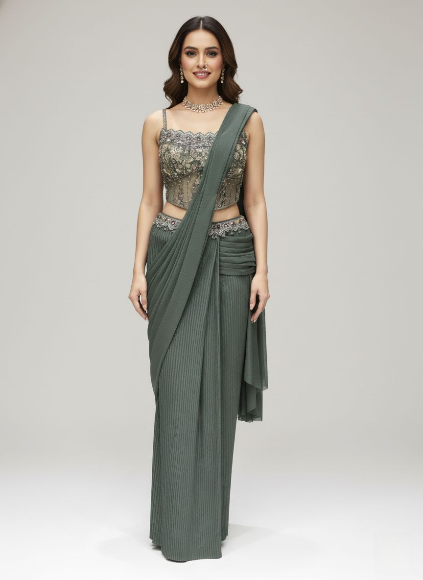 Sage Green Ready-to-Wear Saree with Hand-Embroidered Bustier