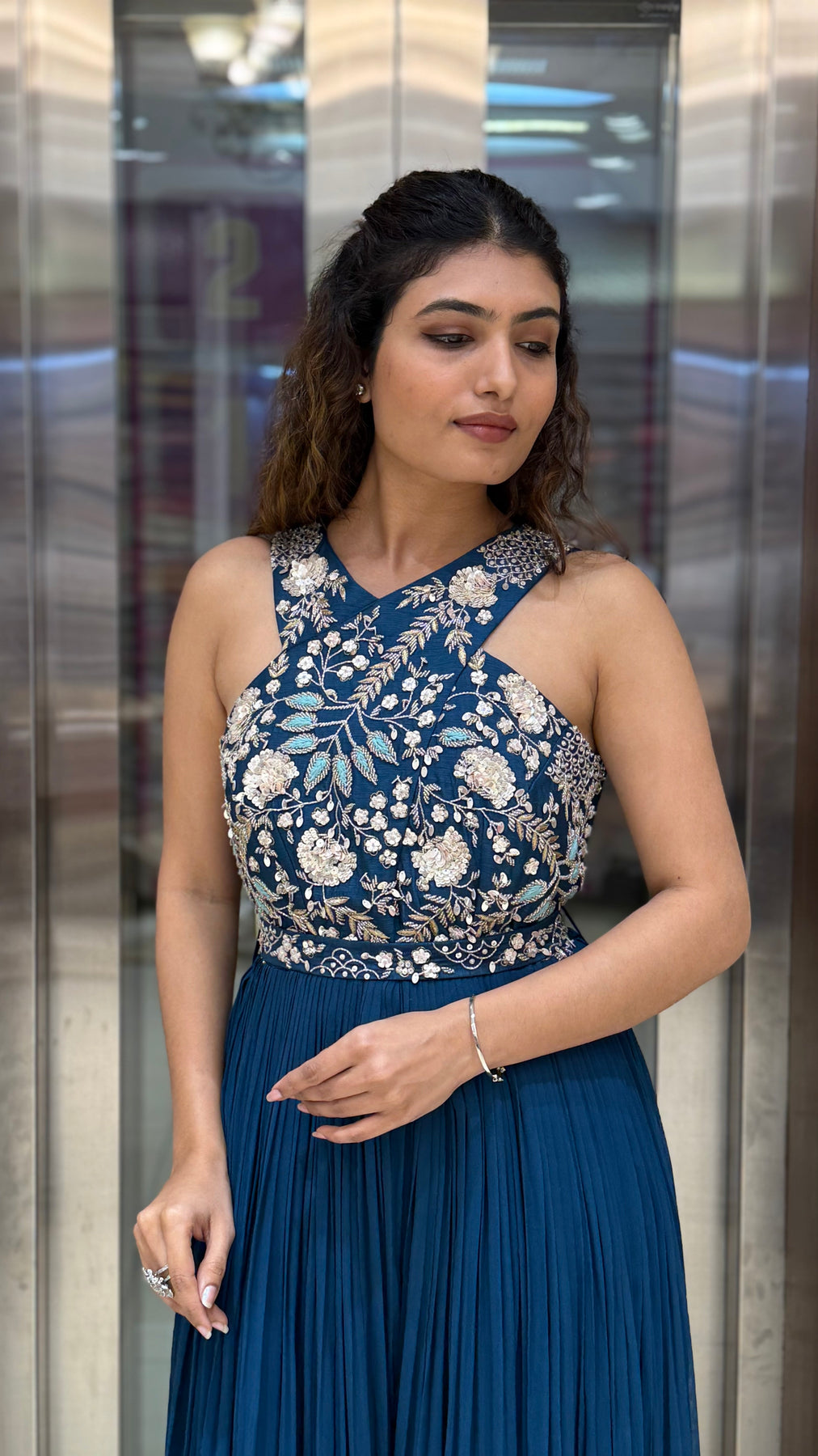 Crafted with a beautifully embroidered bodice featuring intricate floral handwork, this jumpsuit blends ethnic elegance with contemporary flair. The soft pleated flare bottom adds flow and sophistication, giving you the perfect festive silhouette that’s both comfortable and fashionable.