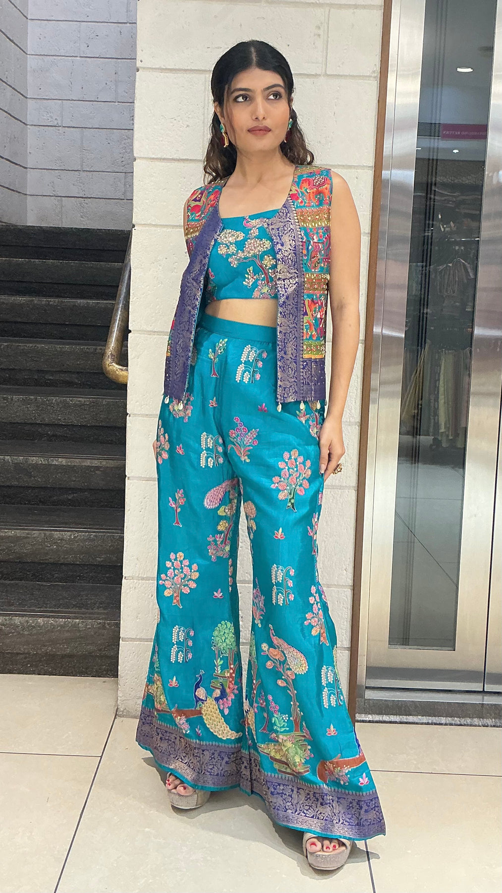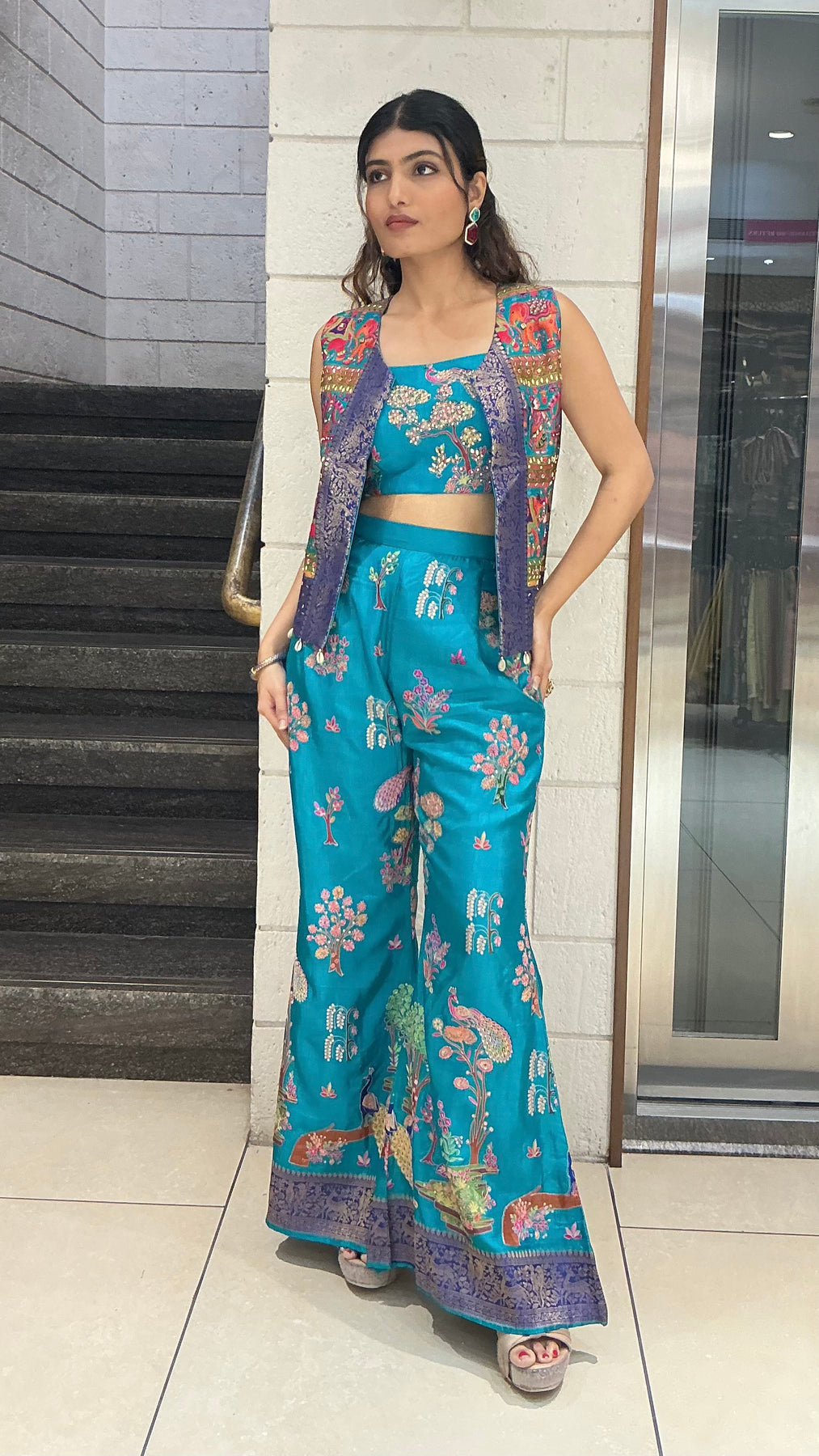Teal Blue Floral Embroidered Designer Palazzo Set with Crop Top & Ethnic Jacket