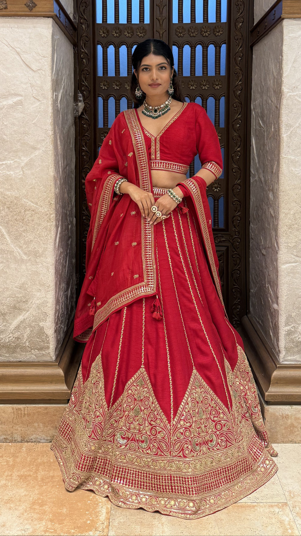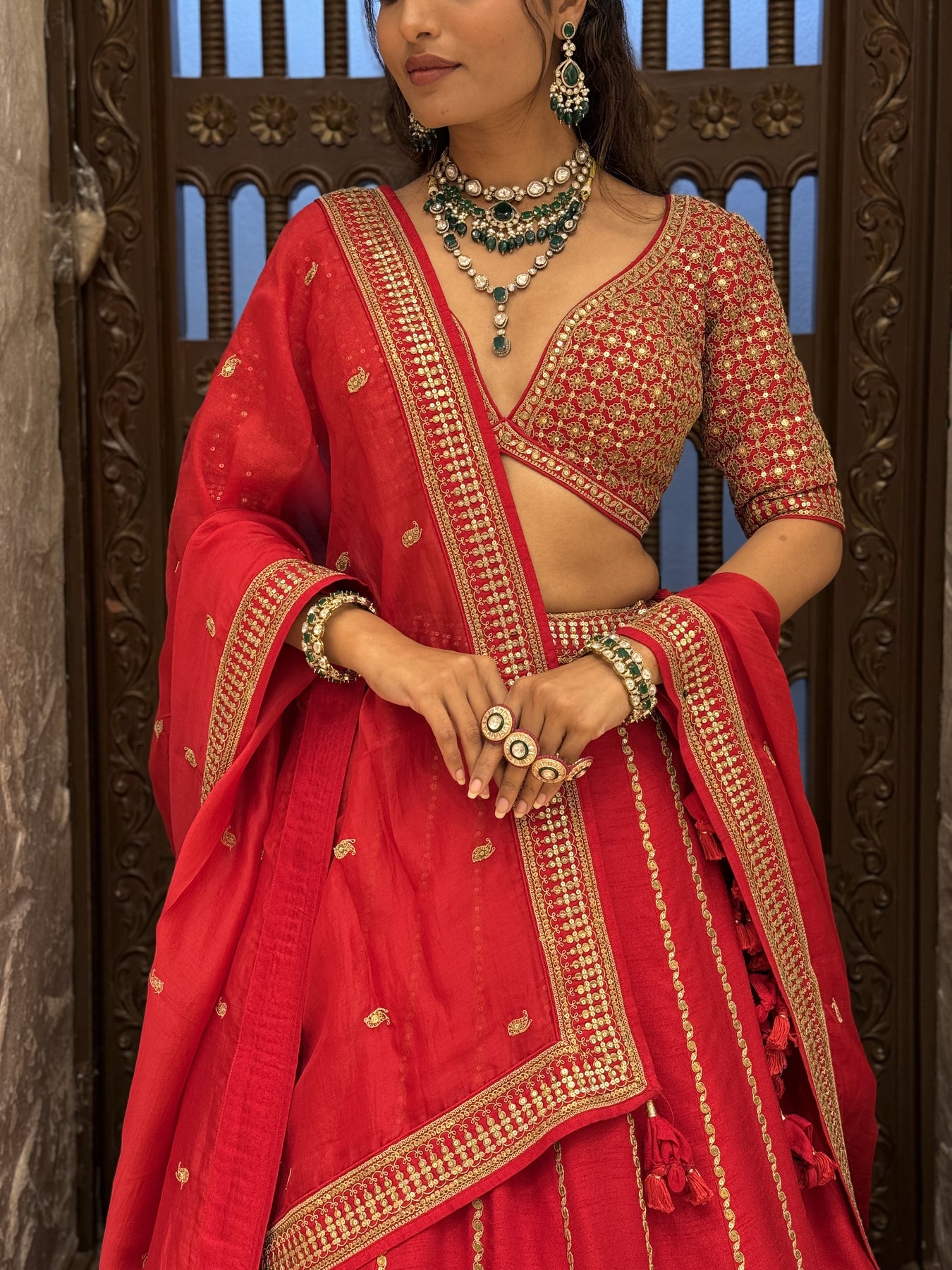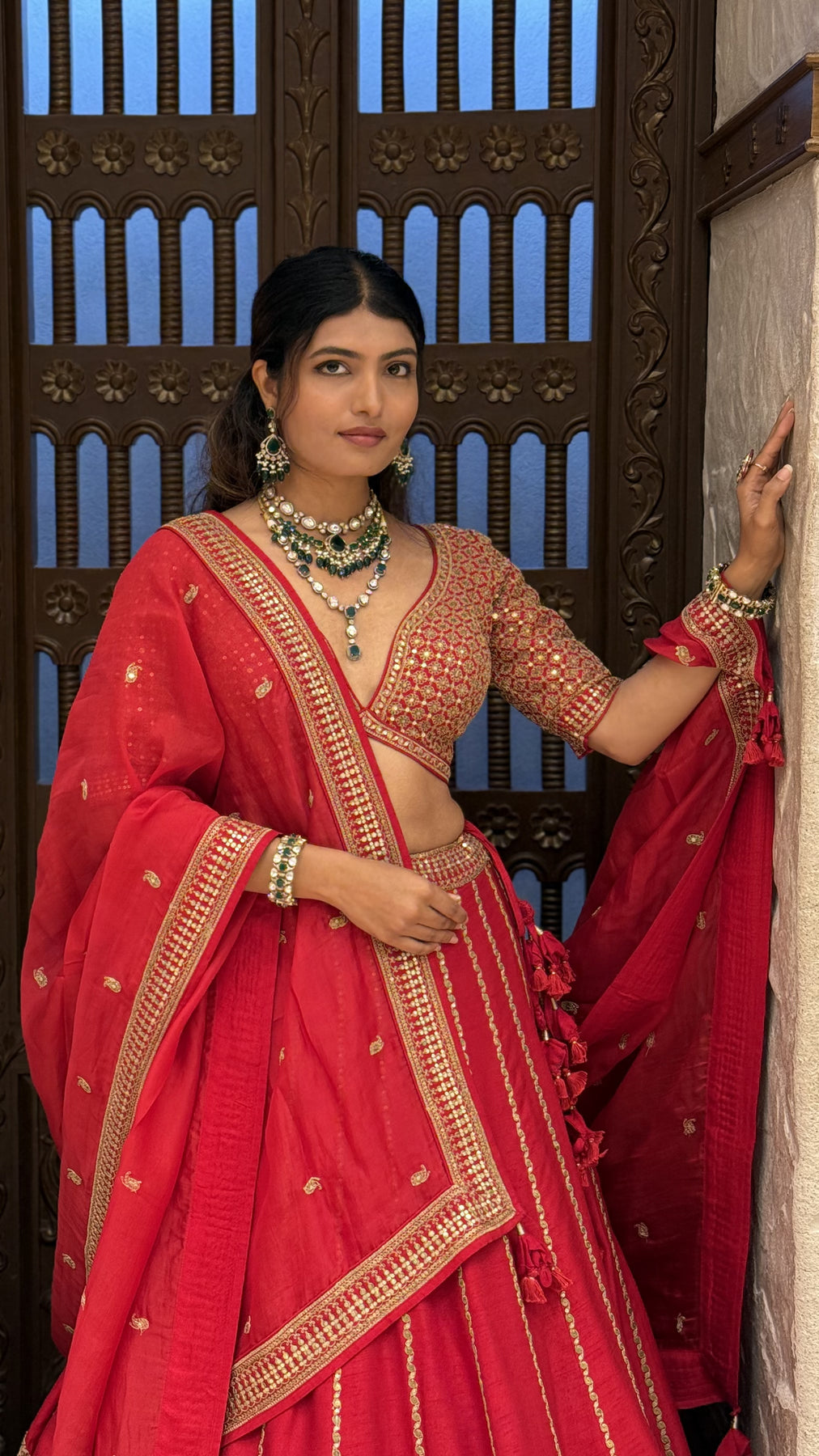 The set includes two coordinated blouses—perfect for changing looks between wedding rituals, receptions, or special occasions. The matching dupatta is finished with detailed embroidery, rich borders, and elegant tassel accents, adding a regal finishing touch.