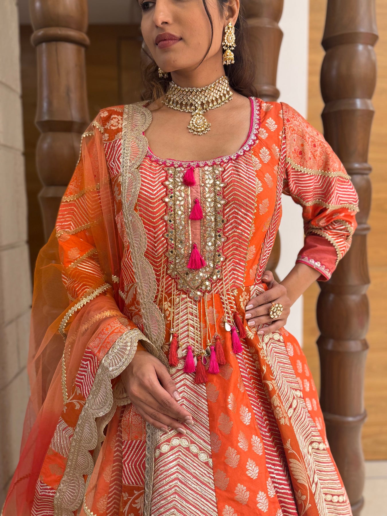 Traditional Orange Embroidered Anarkali Suit with Net Dupatta