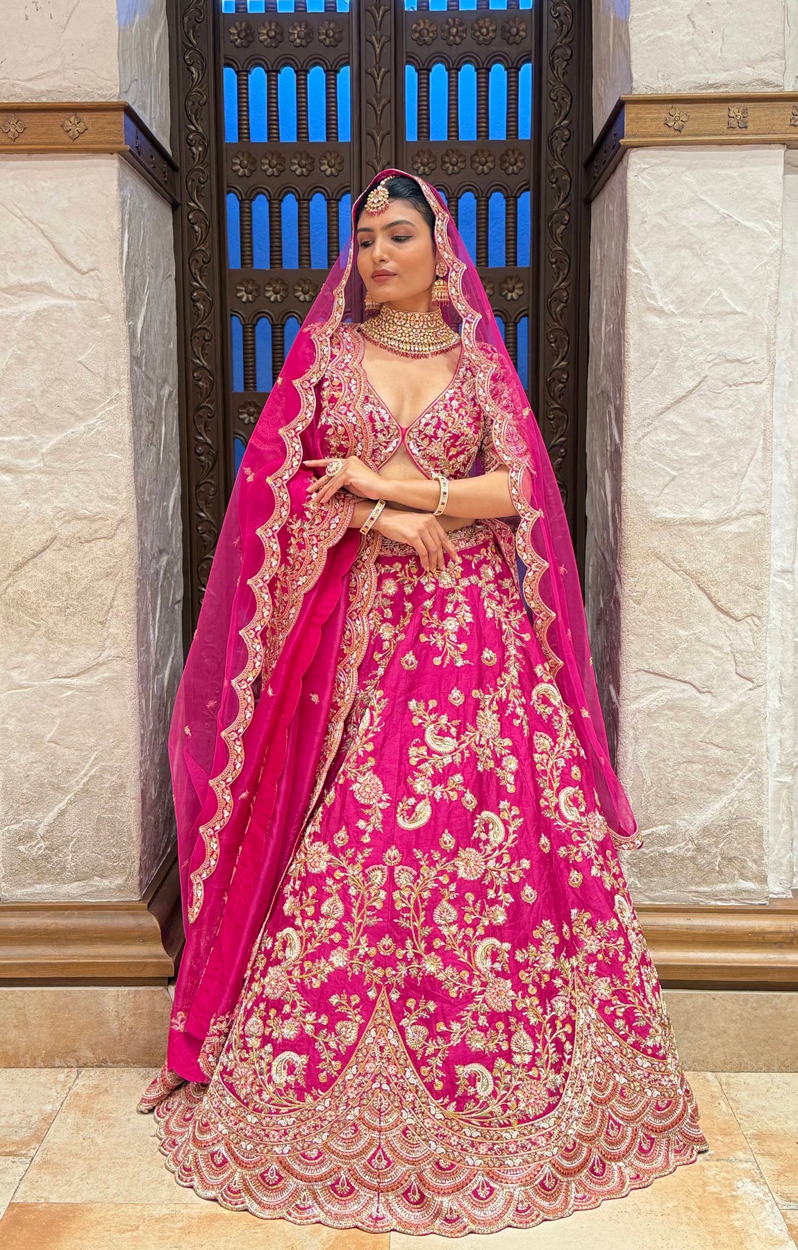 Vibrant Rani Pink Bridal Lehenga with Double Dupatta & Handcrafted Zardozi Embroidery