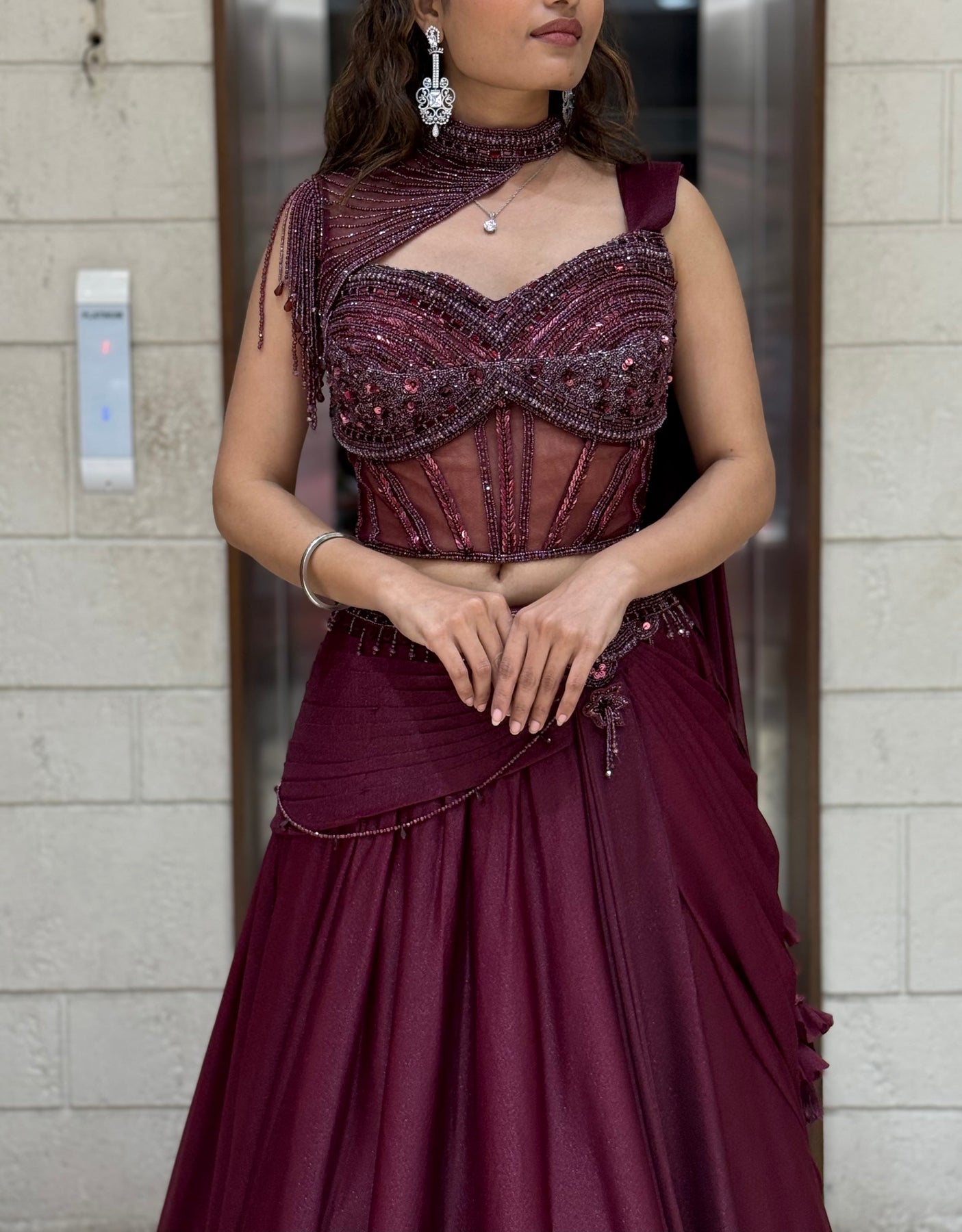 Wine Maroon Indo-Western Lehenga Set with Beaded Corset Blouse & Drape Dupatta